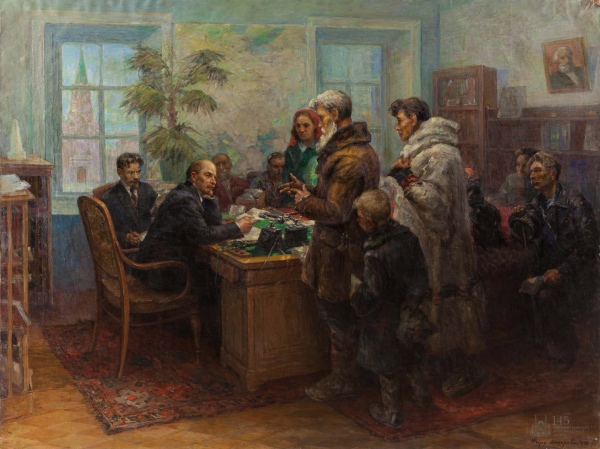 7. 尼古拉·伊万诺维奇·奥谢涅夫师从格拉西莫夫、格拉巴里、杰伊涅卡,是俄罗斯苏维埃联邦社会主义共和国功勋艺术家、波兰人民共和国功勋文化活动家。他1949年创作的画作《十月斯莫尔尼宫》表现了十月革命时领袖在斯莫尔尼宫外和臂缠红布的士兵交谈的情景。