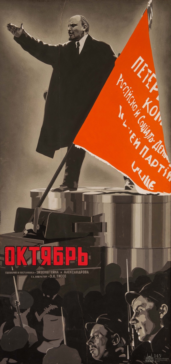 2. 雅科夫·季莫费耶维奇·卢克列夫斯基1927年为纪念十月革命10周年拍摄的电影《十月》创作的原版海报,是历史上第一份带有列宁形象的电影海报。《十月》是苏联著名电影导演爱森斯坦的早期影片之一,是他倡导的以纪实手段来“讲故事”的实验性影片。列宁的夫人克鲁普斯卡娅担当了影片的顾问。