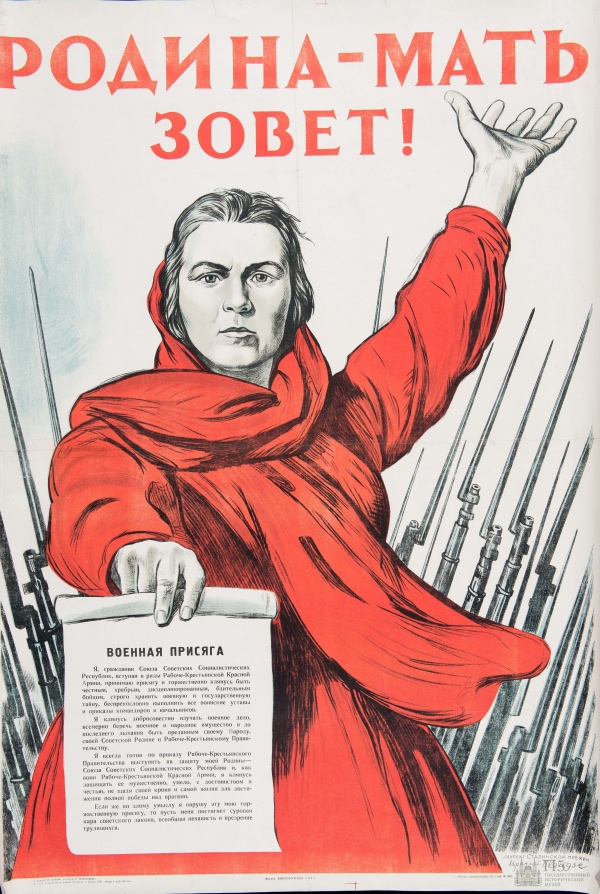 3. 在画家伊拉克利·莫伊谢耶维奇·托伊泽创作的这幅《祖国母亲在呼唤!》海报中,我们看到一位意志坚强的苏联年迈妇女的形象,她是作者创造的、祖国的化身——母亲这一令人难忘的形象。这位伟大的母亲神情严峻,目光坚定,庄重、严肃、充满激情。她庄严地举起手来,号召一切爱国青年走上保卫祖国的最前线,打败侵略者。她手中展示的是一份入伍誓词。