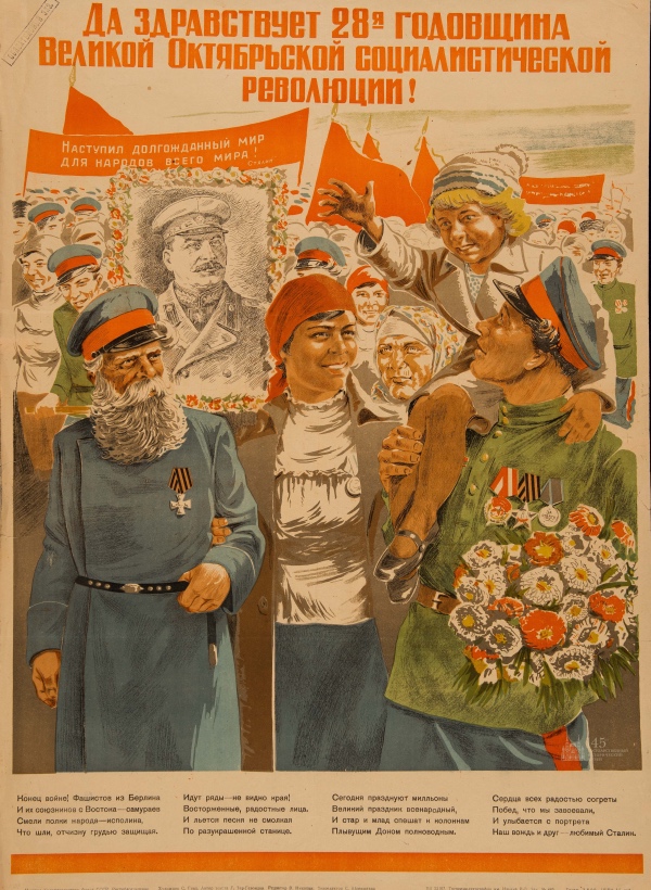 5. 《伟大的十月社会主义革命28周年万岁!》由斯杰凡·伊万诺维奇·金茨创作于1945年。这一年,苏联取得了卫国战争的胜利。金茨在画中传递了这样的信息——侵略就是把自己的道德政治和社会心理行为强加于大众,更是神话了军国主义心理和法西斯种族优越的理论,我们的城市是为保卫家园、反抗侵略者的正义目标而战斗的。飘扬的旗帜渲染了胜利的喜悦和节日的气氛。