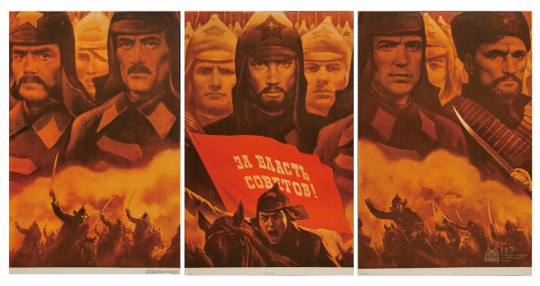 6. 维克多·波里索维奇·柯列茨基1977年创作的《为了苏维埃政权! 》这幅宣传画由三部分组成,整幅作品长近2米。柯列茨基在许多作品中,都塑造了苏联爱国主义者鲜明的形象,作品常常具有戏剧的特性,同时表现手法的简洁使情节显得突出。展出的这幅三联画中高大光辉的英雄形象如丰碑一般,激励着为保卫和建设苏维埃政权的人们。它向人们说明:苏维埃的建立是无数将士浴血奋战的成果。
