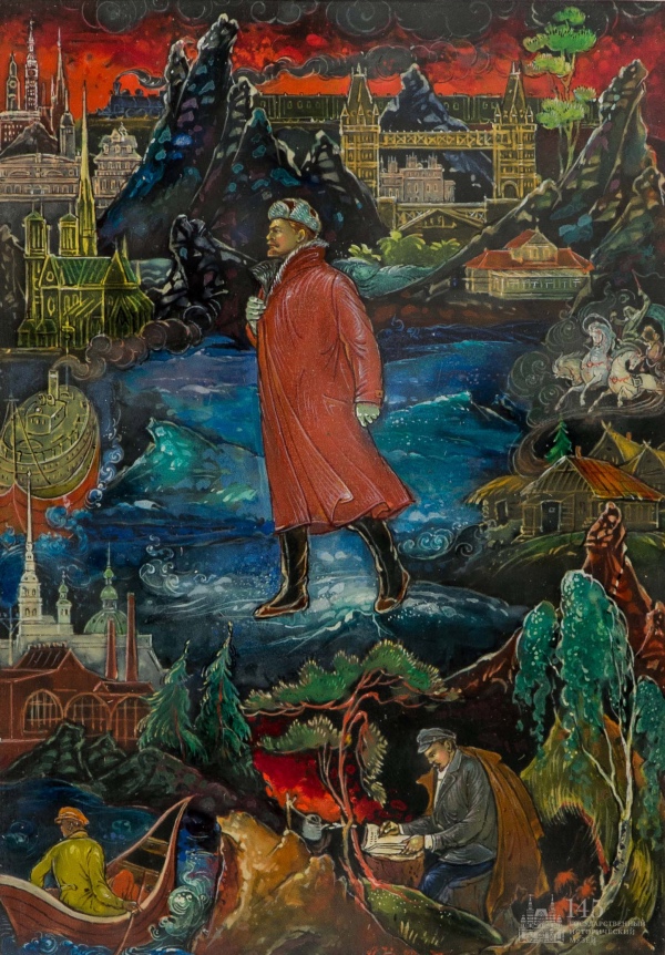 7. 阿列克谢·维克托洛维奇·卡瓦列夫是俄罗斯苏维埃联邦社会主义共和国功勋艺术家。2014年,帕列赫艺术90周年之际,俄罗斯总统普京向他颁发了对国家文化发展和多年富有成效的活动的总统表彰令。这幅作品《列宁侨居国外》秉承了帕列赫微型画的特点,色彩鲜明,线条清晰,其特异之处在于它的丰富的情节和构图的技艺,用不同景次和投影使人物和景物布满了整个画面。