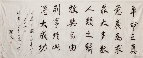 2. 1925年1月21日列宁逝世一周年时,孙中山为纪念和缅怀这位世界上第一个社会主义国家的缔造者而书写的哀悼词。绸面题词为:“革命之真意义为求最大多数人类之解放与自由,列宁于此得大成功”。