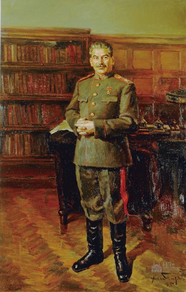3. 德米特里·阿尔卡季耶维奇·纳尔班江是苏联人民艺术家、俄罗斯苏维埃联邦社会主义共和国功勋艺术家、苏联艺术科学院院士。这幅油画《身着军装的斯大林在克里姆林宫办公室》创作于1945年,此时正是苏联卫国战争胜利之时。为体现斯大林生活中的真实性,纳尔班江在克里姆林宫办公室画了大量草图。画中的斯大林身穿军装,胸前佩戴金星勋章,双手合拢,面带微笑,站在办公室里。1946 年,这幅画在特列季亚科夫画廊举办的全苏艺术展展出,并被授予当年的斯大林一等奖金。