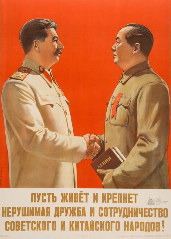 4. 维克多·谢苗诺维奇·伊万诺夫是俄罗斯苏维埃联邦社会主义共和国功勋艺术家、苏联艺术科学院通讯院士、苏联国家奖金获得者。这幅《让苏中人民牢不可破的友谊与合作长存并不断壮大!》宣传画创作于1951年,此时经过毛泽东访苏,中苏签署了《中苏友好同盟互助条约》。海报表现了毛泽东手持带有“列宁”字样的书籍和斯大林真诚握手的形象。