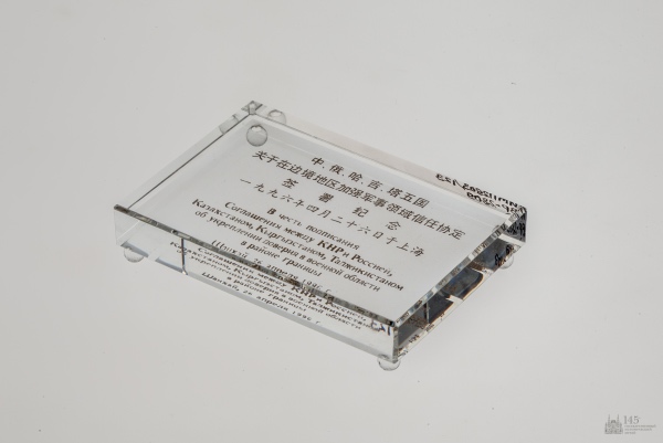 6. 浮雕板是为纪念中国、俄罗斯、哈萨克斯坦、吉尔吉斯斯坦、塔吉克斯坦五国《关于在边境地区加强军事领域信任的协定》的签署而制作的。1996年4月五国元首在上海举行会晤,就各自部署在边境地区的军事力量互不进攻、双方不进行针对对方的军事演习等达成协议,为丰富由中俄两国始创的以“结伴而不结盟”为核心的新型国家关系提供了新型区域合作模式。