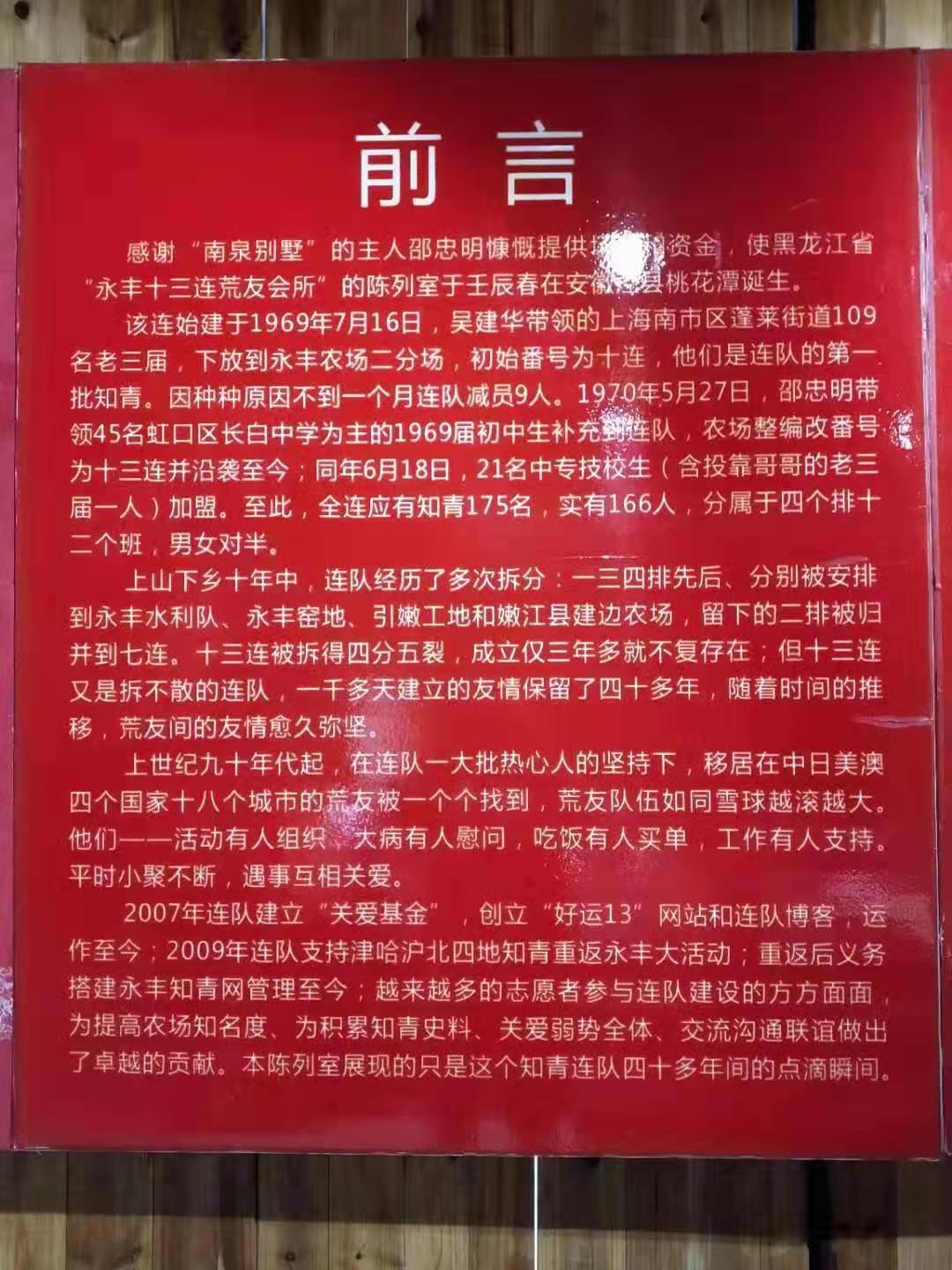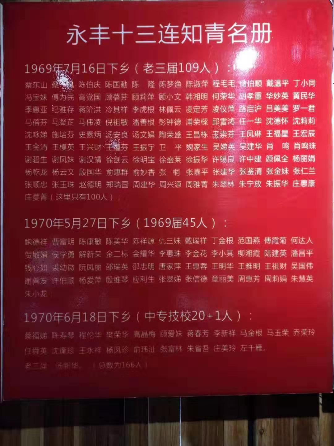 我们到安徽桃花潭采风,闻讯老街有家知青屋。从屋后进入南泉别墅,还有一家”永丰13连会所。在中国知青馆昆明会上,听肖鸣讲她们的二家知青屋。那是黑龙江永丰知青的心意和杰作。 在美丽乡村建设中,诞生不少具有知青符号的景点,场馆,他们都有资金支持,收益入帐。 但是,落脚在安徽泾县桃花潭镇的《永丰农场13连知青陈列室》,只是存储连队知青记忆的地方,若不是肖鸣在中国知青馆昆明会议披露了此信息,兴许会成为一颗时间胶囊。 这颗胶囊是黑龙江永丰农场13连知青的杰作,不是江西永丰县,也不是安徽永丰镇的。这家知青陈列室与当地乡镇,与当地知青没有关系。路过桃花潭镇知青屋的安徽知青旅客感叹,整个安徽省也少见知青馆,竟在此撞见。其实,他们看到的”知青屋”是黑龙江永丰农场的,从知青屋后门进入南泉别墅,那里还有一间”永丰农场13连知青陈列室”。 ![]() ![]() 前言 感谢 “南泉别墅 ”的主人邵忠明慷慨提供资金 使黑龙江省“永丰十三连荒友会所"的陈列室于壬辰春在安徽泾县桃花潭诞生。 该连始建于1969年7月16日,吴建华带领的上海南市区蓬莱街道109名老三届下放到永丰农场二分场 ,初始番号为十连 ,他们是连队的第一批知青。因种种原因不到一个月连队减员9人.1970年5月27日 邵忠明带领45名虹口区长白中学为主的1969届初中生补充到连队,农场整编改番号为十三连并沿袭至今;同年6月18日,21名中专技校生(含投靠哥哥的老三届一人)加盟.至此,全连应有知青175名,实有166人,分属于四个排十二个班,男女对半。 上山下乡十年中,连队经历了多次拆分:一三四排先后、分别被安排到永丰水利队 永丰窑地,引嫩工地和嫩江县建边农场 ,留下的二排被归并到七连 。 十三连被拆得四分五裂 ,成立仅三年多就不复存在;但十三连又是拆不散的连队 ,一千多天建立的友情保留了四十多年 ,随着时间的推移,荒友间的友情愈久弥坚。 上世纪九十年代起 在连队一大批热心人的坚持下 ,移居在中日美澳四个国家十八个城市的荒友被一个个找到 ,荒友队伍如同雪球越滚越大。 他们——活动有人组织,大病有人慰问, 吃饭有人买单 ,工作有人支持。平时小聚不断 ,遇事互相关爱。 2007年连队建立 "关爱基金" 创立 “好运13"网站和连队博客运作至今;2009年连队支持津哈沪北四地知青重返永丰大活动;重返后义务搭建永丰知青网管理至今;越来越多的志愿者参与连队建设的方方面面。 为提高农场知名度 为积累知青史料 ,关爱弱势群体交流沟通联谊做出了卓越的贡献。 本陈列室展现的只是这个知青连队四十多年间的点滴瞬间。 永丰十三连知青名册 (1969年月16日下乡(老三届109人) 蔡东山 蔡一凤 陈伯庆 陈国勳 陈 隆 陈梦渔 陈淑萍 程毛毛 储伯顺 戴温平 丁小同 冯宝妹 傅为民 高党国 顾蓓芬 顾莉萍顾小文 韩湘明 何荣华胡孝重 华妙英 黄民华 季惠亚 纪雅存 蒋阶洪 冷其祥 李虎根 林佩云 凌定芳 凌仪萍路启沪 吕美美罗一君 马蓓芬 马凝芷 马伟凌倪祖敏 潘善根 彭钟德 浦荣樑邱雪鸿 任一华 沈德怀 沈莉莉 沈咏娣 施培芬 史素炳汤安良 汤文娟 陶荣盛 王昌栋 王崇芬 王凤琳 王福星 王宏辰 王金清 王模英 王兴财 王蕴芬 王振宇卫 平 魏家生 吴娣英 吴建华肖 鸣 肖鸣珠 谢碧生 谢凤妹 谢汉靖 徐剑云 徐明宝 徐盛莱徐振华 许锡良 许中建 颜佩全 杨丽娟 杨乾龙 杨云文殷国华 俞惠群 俞妙香 张 桐 张嘉平 张建华 张鉴清 张金妹 张仁兰 张顺忠 张玉珠 赵德明 郑瑞国 周建华 周兴源 周雅菁 朱翠林 朱宁放 朱振华 庄惠康 庄蔓菁(这里只有100人) 1970年5月27日下乡(1969届45人): 鲍德祥 曹富明 陈康敏 陈美华 陈祥源 仇三妹 戴瑞祥 丁金根 范国燕 傅霞菊 何达人 贺敏娟 侯学勇 解新荣 金二标 金耀华 李惠珠 李金花 李小其 柳湘霞 陆建英 潘昌平 钱心如 裘幼微阮凤丽 邵瑞英 邵忠明 唐家萍王惠蓉王明华 王雅明 王祖财吴国伟 谢善发 许伯顺 杨爱萍 殷维琴 应利生 张翠娣 张信德章丽美 周惠芳周莉娟 朱慧英 朱小龙 1970年6月18日下乡(中专技校20+1人): 蔡福娣 陈寿琴 程伦华 樊荣华 高晶梅 顾爱妹 蒋春芳 李新祥 马金根 马玉荣 乔荣玲 任舜英 沈逢珍 王永祥杨凤珍 俞玮沚张富林 朱省吾 庄美玲 左干雁 老三属 汤新华 (总数为166人)」 ————————— (责任编辑:晓歌) |