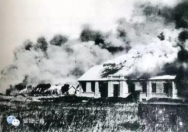 1931年9月18日夜,日本关东军炸毁沈阳北郊一段南满铁路的路轨,制造藉口进攻中国东北军驻地北大营,发动了“九一八事变”。图为烧毁中的北大营。
