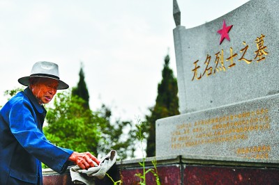 安徽怀远县陈集镇,88岁的胡兆伦老人在烈士陵园擦拭无名烈士墓碑。新华社发
