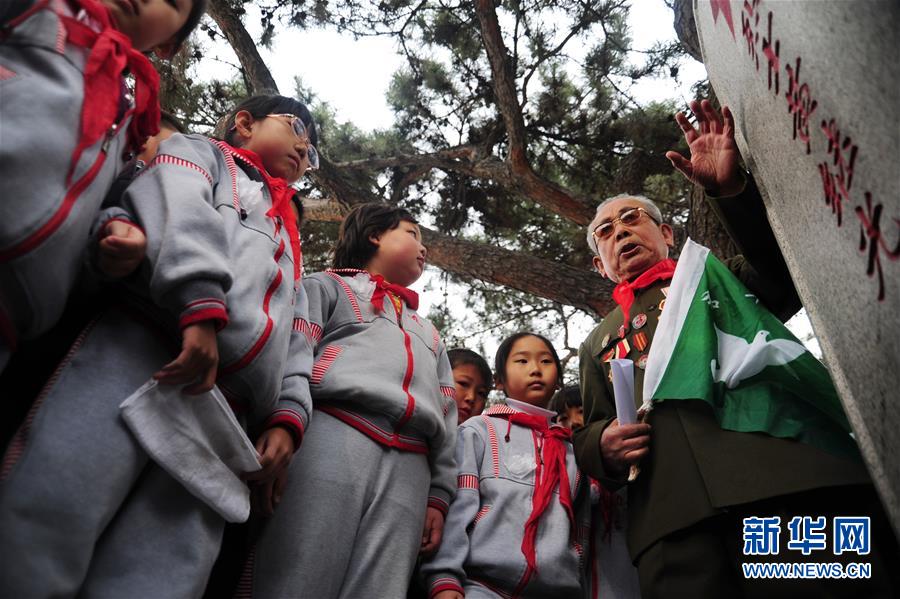 在沈阳抗美援朝烈士陵园,志愿军老战士李维波(左一)向学生们讲述邱少云的英雄事迹(2014年4月3日摄)。新华社发(张文魁 摄)