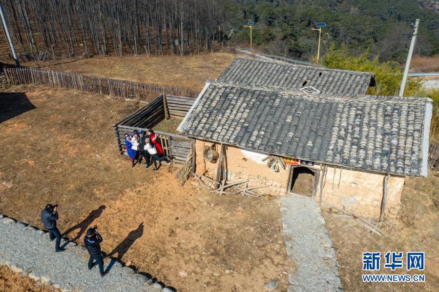 在四川省凉山彝族自治州冕宁县彝海村的“彝海结盟”红色旅游文化景区,游客在保留下来的彝族老房子前拍照留念(无人机照片,1月14日摄)。新华社记者 沈伯韩 摄