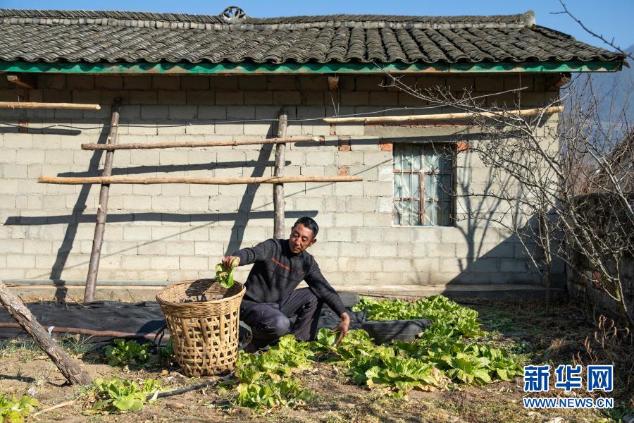在四川省凉山彝族自治州冕宁县彝海村,沙马薯姑在家中的菜地里采摘蔬菜(1月14日摄)。新华社记者 沈伯韩 摄