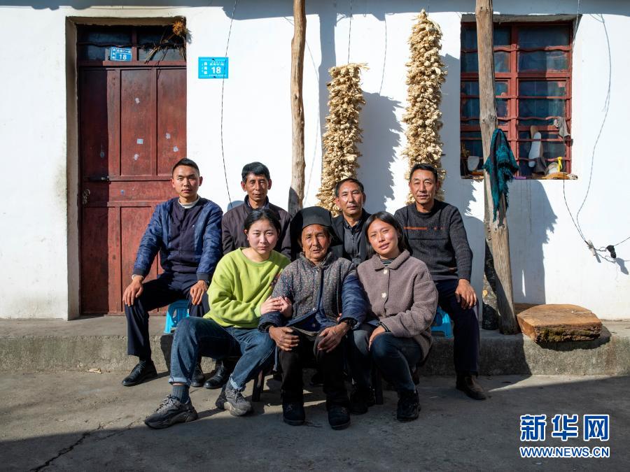 在四川省凉山彝族自治州冕宁县彝海村,84岁的苏久克的莫(前中)与儿子沙马克姑(后左二)、沙马依姑(后右二)、沙马薯姑(后右一)及孙辈们在家中拍摄合影(1月14日摄)。新华社记者 沈伯韩 摄