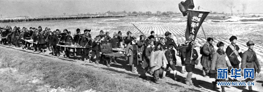 在辽沈战役中,当地百姓组成担架队,积极支援人民解放军(资料照片)。新华社发