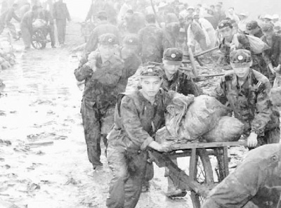 1998年7月,为确保荆江大堤的安全,数千名解放军官兵以惊人的毅力坚守在大堤上,排除决堤险情。图为战士们运送袋装沙石加固大堤。新华社记者 李 刚摄