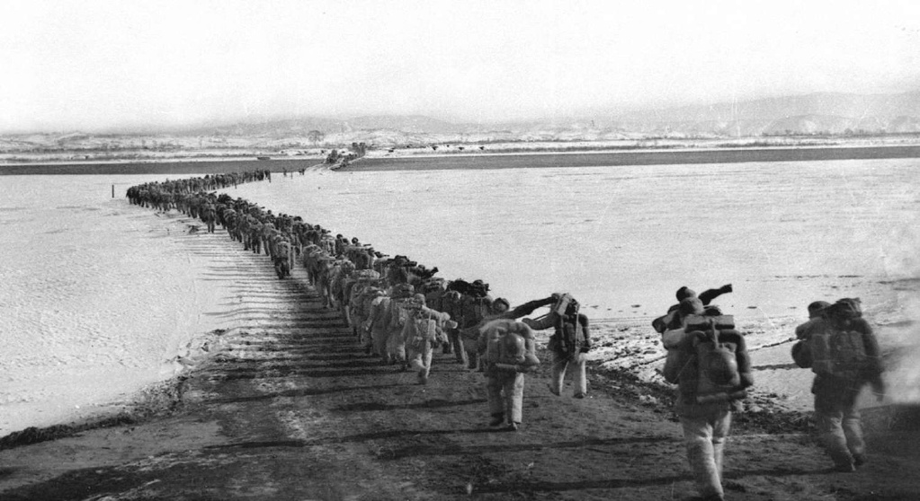 1950年10月初,美国侵略军悍然越过“三八线”,并把战火烧到中国边境。10月19日,中国人民志愿军雄赳赳、气昂昂,跨过鸭绿江,和朝鲜人民共同抗击侵略者。(图片来源:新华社)