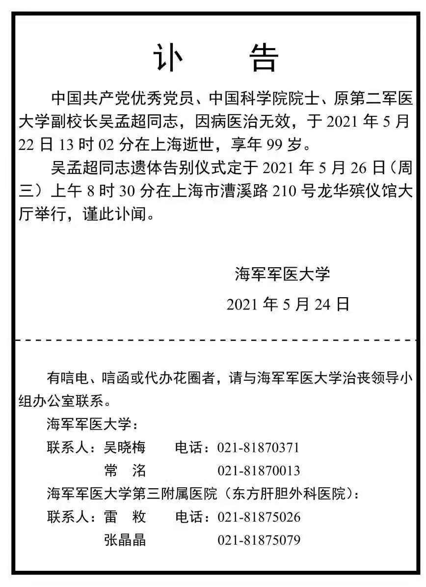 海军军医大学发布讣告 吴孟超同志的遗体告别仪式 定于2021年5月26日(周三) 上午8:30在龙华殡仪馆举行 用一生诠释“医生” 吴老,一路走好! (责任编辑:晓歌) |
