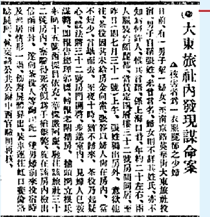 ■首席记者 郭泉真 编者按:解放日报建党百年典藏特刊《印迹——一百个版里的中国共产党一百年》,已于5月27日面世。特刊从《申报》(1872-1949)、延安时期中共中央机关报《解放日报》(1941-1947)、1949年在上海创刊至今的《解放日报》,从1921年至2020年的数十万个版面中,逐年选出总计上百个版面及报道,从独特的视角反映了党的百年历程。今起本报陆续选登部分版面的纵深详考。 1921·暗夜枪声 1921年7月31日凌晨,上海大东旅社(今永安百货所在),传出一声枪响。 1921年8月1日《申报》第14版 大东旅社内发现谋命案 ▲被害者为一衣服丽都之少妇 日前,有一男子挈一妇女至南京路英华街大东旅社投宿。男子自称张姓,未曾言名;妇女则不详其姓氏,亦不知为何许人,惟其言语系上海口音,年约二十左右。两人服装均颇丽都,当赁定四层楼三十二号房间同居。至昨日(即七月三十一号)上午,张姓独出房外,意欲他往。茶役因其未给房金,向索,张答以“妇人尚在房内,当不短少”,言毕而去。至夜十时,犹不归来,茶役乃起疑心,设法将三十二号房门开启,步进室内,见妇人已被谋毙,即报告总理郭标,转报老闸捕房。捕头开立根氏率同十五号西探目依克、华探严阿庆,驰往该旅社三十二号房内。察验得死者似为手枪击毙,旋在该房内检出信函两封,遂向茶役人等询问此一双男妇前来投宿时及起居情形一过。饬将尸体舁出,装车运往虹口斐伦路验尸所,候禀请公共公廨中西官验明再核。 这声枪响,惊醒了睡梦中的住客陈公博。按他的说法,他就住在隔壁一间客房。 大东旅社,1918年永安公司开业时附设的高档旅馆,当年上海滩四大旅社“三东一品”(大东旅社、东亚旅社、远东旅社、一品香旅社)之一,地处繁华的南京路、英华街(即今永安百货所在的南京东路、金华路)。来沪参加一大、又带着妻子来“补度蜜月”的陈公博,没有住在代表们的集体宿舍博文女校(今太仓路127号),而选择了2公里外的大东旅社,也因此意外遭遇了这声枪响。 陈公博在回忆文章中写道:前一天晚上,他与其他代表在中共一大会场遭遇了“陌生人闯入”事件;他被法国巡捕盘问了“足有两个钟头”,好不容易才脱身回到大东旅社;“七月三十一那天早上五点多钟”,又在睡梦中被枪声惊醒——“忽听有一声很尖厉的枪声,继续便闻有一个女子的锐厉悲惨呼叫”。 就此,后人根据《申报》这则新闻明确记载的7月31日,推导一大会议是30日遭遇“陌生人闯入”,进而结合其它线索进一步倒推出——开幕在7月23日。 由于年代久远,当事人记忆不一,中共一大开幕的准确日期一直难以确定。1941年《中央关于中国共产党诞生二十周年、抗战四周年纪念指示》将7月1日作为党成立纪念日,此后每年7月1日成为中国共产党纪念日。1979年,解放军原后勤指挥学院教授、党史专家邵维正找到《申报》这则新闻,并结合其它线索证据,最终在20多种说法中,确定了一大召开日期。胡乔木充分肯定这一研究成果,将论文推荐发表在1980年《中国社会科学》创刊号,编辑在卷首加发按语表示:回答了“长期未解决的疑难问题”。上世纪80年代,中央党史研究室编写《中共党史大事年表》,将一大召开日期确定为7月23日。 邵维正今年2月16日向解放日报记者表示:大东旅社这件事与中共一大本身并无联系,是一个偶然的事件、间接的史料,但因为发生在同一个时间节点,因为历史的际遇,在同一天碰上了。 那天凌晨惊魂未定的陈公博,没有继续参加转移到嘉兴南湖红船的一大会议,而是当天就和妻子赴杭州西湖游山玩水去了。大浪淘沙。在此后的斗争岁月中,他从早年的热情与追求逐步蜕化,脱党而去,最后沦为汉奸。 百炼成钢。当时的社会与日常环境,就是这则《申报》新闻反映出的,命案枪声在繁华街头响起的暗夜。在反动统治的白色恐怖下秘密举行的中共一大,在当时的报纸上不可能有什么报道,好像什么事也没有发生。但是,就在这时,一个新的革命火种已在沉沉黑夜的中国大地上点燃起来了。 1922·谁是同志 这是一条非常不起眼的新闻,拢共90字,藏在版面里。 1922年9月3日《申报》第15版 李大钊今日在职业学校讲演 青年星期演讲会于今日下午一时邀请北大教授李大钊,在中华职业学校演讲青年问题。该会以此问题极关重要,特邀印力志、沈雁冰、杨贤江等加入演讲,临时听者尚可发问云。 不过,深入追索这个日期,可以发现:在见报的行踪背后,隐藏着李大钊与孙中山两位伟人,在当时、在上海,未见报的一次历史性会面;隐藏着中国共产党人在民主革命早期,为民族、国家大业,主动探求国共第一次合作的热忱与奔赴。 1922年8月,孙中山因广东军阀陈炯明叛乱,离开广州来到上海。 1922年8月19日《申报》第11版 孙中山离粤纪 ▲孙陈龃龉之追述 ▲中山北伐之失败 ▲西南政府之结局 孙中山于八月九日乘英舰离粤。是日午后五时,粤政府分遣汽车多辆,沿广州市马路,纵横驰突,燃爆疾呼。车上插有白旗两面,一面书曰“今日午后三时孙中山乘英舰离粤赴上海”,一面书曰“欢送孙先生离粤”。孙氏既毅然离粤,粤局亦从此告一段落矣。 陈炯明以龃龉之故,竟至推倒中山,诚天下之险人哉。 中山是坦白爽直者,生平以革命为生涯,不计利害成败,且并不知有利害成败也。 九年十月,陈率粤军由东江返广州,驱逐十年以来盘据广东之桂系军阀。中山亦即由上海回粤,