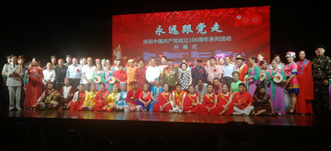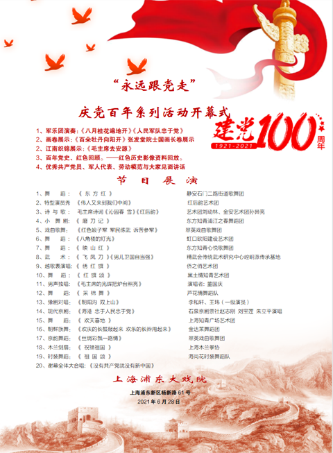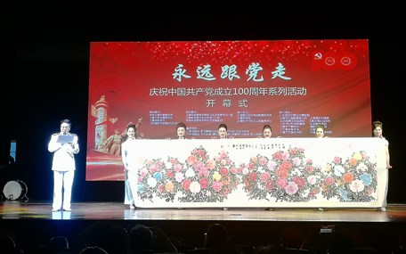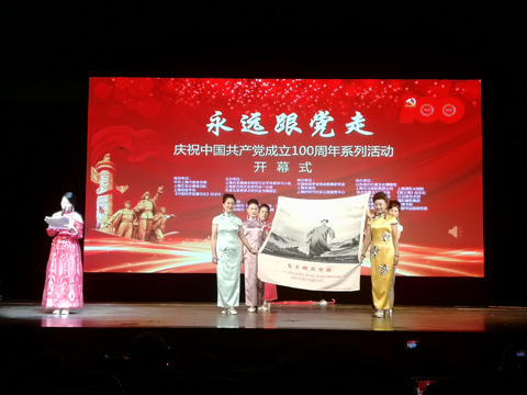 2021年6月28日下午,由上海百老德育讲师团学习习近平思想学习小组、上海新四军历史研究会一分会、毛泽东思想学术研究会书画院主办的庆祝中国共产党成立100周年系列活动开幕式,在上海浦东大戏院隆重举行。上海百老德育讲师团荣誉团长戚泉木、空军驻沪总代表傅新民将军、全国著名战斗英雄孙佑民、中共中央办公厅毛泽东思想学术研究会书画院院长张发堂院士、沂蒙新红嫂全国优秀共产党员朱呈镕、上海志愿者奖励基金管理委员会副主任朱伟民、上海市木兰拳协会长应美凤等嘉宾出席了开幕式。![]() 100年前的七月,一个伟大的党,庄严宣告成立! 100年前的七月,一面中国共产党火红的旗帜,冉冉升起! 鲜红的党旗,经历了百年洗礼,今天更加鲜艳夺目, 鲜红的党旗,经历了百年锤炼,今天更加昂首屹立! 开幕式以军乐团奏乐《走进新时代》《人民军队忠于党》隆重开场。 ![]() 系列活动组委会主席、《 新民晚报 社区版》主编、上海协申联合大学校长何纪椿致词。他回顾了一百年前中国共产党的成立,经过战火考验、浴血奋战,建立了新中国。建国后,社会主义建设和改革开放蓬勃发展,取得了世人瞩目的伟大成就。他说,如今我们信心满怀向第二个百年的新征途出发。我们由衷的感叹中国共产党能,马克思主义行,社会主义好!他说,为铭记党恩、报效党恩,上海戏曲学会歌舞研究会会长李厚同志以坚定的信念,饱满的热情,精心设计了思想性艺术性强的这次系列活动,吸收了上海众多的优秀艺术团队,推出了展演、展览、展示和论坛等系列活动,重温党的峥嵘岁月,激发中华儿女在新的百年再创伟业的豪情壮志。让我们薪火相传,生生不息,中华复兴大业永远在路上。预祝开幕式圆满成功! 开幕式上,张发堂院士将《百朵牡丹向阳开》献给党的五米画卷捐献给这次系列活动,上海市静安区江南织锦画艺术交流中心将江南织锦《毛主席去安源》挂画,向党百年华诞的献礼。 开幕式播放了《百年党史、红色回顾》的红色历史影像资料,展现了中国共产党领导的中国无产阶级革命和社会主义建设的波澜壮阔的历史。 ![]() 全国著名的战斗英雄,参加过抗日、解放和抗美援朝战争的孙佑民老英雄,上台讲述他在中国人民解放战争中英勇战斗的经历。孙老英雄16岁加入中国共产党,经历陆军、空军,当过步兵、炮兵,飞过战斗机和运输机。他荣获得“一级优等飞行员”称号和二、三等功各种奖励十五次,是独立荣誉勋章和解放奖章获得者,获军功章奖百多枚,曾两次飞临天安门接受毛主席等党和国家领导人检阅。 ![]() 山东沂蒙新红嫂、全国优秀共产党员,被边防哨所解放军誉为“最美兵妈妈”、新时期拥军优属好模范、两次受到习近平主席接见的朱呈镕同志,上台作了当年山东沂蒙人民为中国解放涌现出的红嫂事迹报告。朱呈镕同志是山东朱老大食品有限公司党委书记、董事长,从2001年以来,她继承和发扬沂蒙红嫂精神,在做大做强企业的同时,热心社会公益事业,长期坚持拥军优属,得到了上级领导和有关部门的高度评价和赞扬。2012年7月,被临沂市委、市政府授予 “沂蒙新红嫂”荣誉称号。 ![]() “东方红太阳升,中国出了个毛泽东,他为人民谋幸福,他是人民大救星!”开幕式文艺演出以《东方红》歌舞开拉序幕。二十余个舞蹈歌曲、演唱和京剧武术等不同形式的节目,歌颂和展示了在中国共产党带领全国人民,为中国人民的解放浴血奋战,为中华民族的振兴永远奋斗的伟大功绩。 舞蹈《八角楼的灯光》,展现了在经历了一次次失败,经历了曲曲折折的长征路途,全党全军越来越认识到毛主席是中国革命走向胜利的领路人。舞蹈《映山红》,体现了红军与人民鱼水深情,难舍难分。红军来了映山红就开满遍地,就一片阳光美好,表现人们对亲人的期盼和对美好未来的追求!现代京剧歌舞《红色娘子军 军民练武 诉苦参军》,表现了受压迫的穷人,只有拿起枪,参加自己革命的军队,才有出路,才能翻身求解放!越歌表演唱《绣红旗》,体现了江姐等革命者既坚强斗争又有美好追求的革命情怀。舞蹈《红旗颂》,气势磅礴的音乐加上激情奔放的舞蹈,代表了新中国新时代人们的豪情满怀,奋发向上的精神。男声独唱《毛主席的光辉把炉台照亮》,唱出了在困难中炼钢工人想起毛主席的教导,建设新中国的热情比炉火还旺,表现了工人阶级美好的理想激励他们建设明天更美好的祖国。木兰剑扇组合《祝福祖国》,综合了多项木兰技艺,由兼、双扇、金银扇组合共同来祝福伟大祖国繁荣昌盛。 ![]() 文艺演出结束时,全场共同高唱《没有共产党就没有新中国》,气氛热烈,掌声不断。 系列活动承办单位有中国戏曲学会戏曲歌舞研究会、上海老报馆、上海好时代社区公益服务中心。 ![]() ![]() 主持人: 安好 黄岩 ![]() 五米画卷《百朵牡丹向阳开》献给党,张发堂院士展示。 ![]() 江南织锦《毛主席去安源》挂画向党献礼,上海静安区江南织锦画艺术交流中心展示。 ![]() 毛主席诗词 《沁园春 雪》演唱 金安艺术团 孙异亮 ![]() 小舞剧《磨刀记》 东方知青浦江之春舞蹈团 ![]() 舞蹈《八角楼的灯光》 虹口欧阳建设艺术团 ![]() 现代京剧歌舞《红色娘子军 军民练武 诉苦参军》 翠英戏曲歌舞团 ![]() 舞蹈《映山红》 东方知青心悦歌舞团 ![]() 现代京剧联唱《海港 忠于人民忠于党》 上海石泉京剧票社 