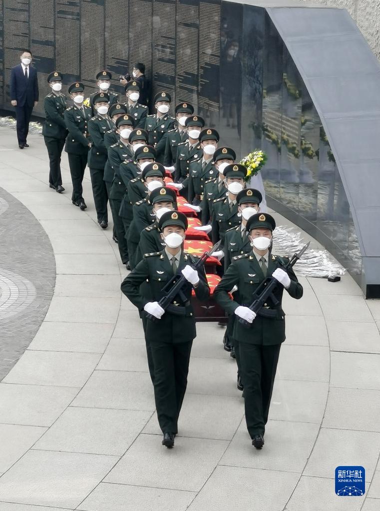 10时,军乐队奏响《思念曲》,仪式正式开始。在解放军战士持枪护卫下,礼兵护送志愿军烈士棺椁缓缓步入现场,全场奏唱中华人民共和国国歌。 全体人员向志愿军烈士三鞠躬,27名礼兵鸣枪12响,向英烈致以崇高的敬意。 ![]()
