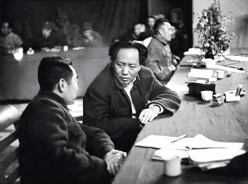 1945年召开的党的七大,确立毛泽东思想为党的指导思想,使全党在思想上政治上组织上达到空前统一和团结。图为毛泽东、周恩来、朱德同志在七大主席台上。 新华社发