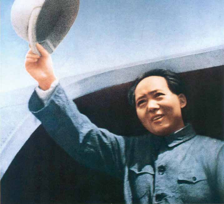 ·1945年,毛主席赴重庆谈判前,在延安机场向欢送的军民挥帽告别。
