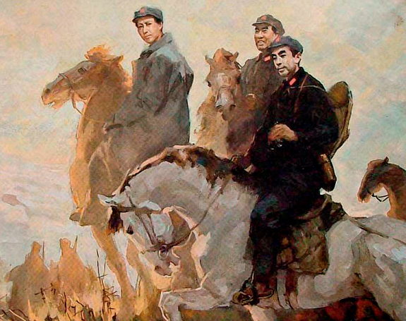 ·《二渡赤水——毛主席在长征途中》油画,从左至右依次为毛泽东、朱德、周恩来。