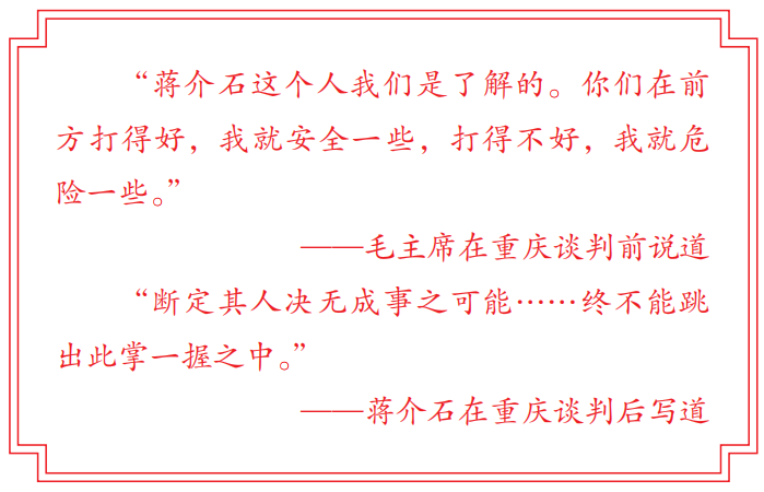 当时担任毛主席副官的蒋泽民回忆:“无论谈判多么紧张,斗争多么尖锐,争执多么激烈,毛主席的表情是平静的,举止是从容的,讲话时的语调也都是温和的。” 除主持谈判外,毛主席还同国民党内的各派人物进行了广泛接触,包括一向反共的陈立夫、戴季陶等人。 有一次,毛主席正好在小路上同蒋介石相遇。听毛主席说去见了戴季陶,蒋介石先是一怔,然后说:“好,见见好,见见好。” 有些顽固反共的人指责:共产党“不要另起炉灶”。毛主席答:“‘不要另起炉灶’的话我很赞成,但是蒋介石得要管饭,他不管我们的饭,我不另起炉灶怎么办?” “蒋介石日记显示,重庆谈判期间他一度想要扣留、‘审治’毛主席,‘根绝共匪’,又怕国内外‘再起纷扰’,最终‘不敢稍有孟浪’。”杨天石对环球人物记者说,“经过重庆的接触,蒋介石意识到共产党的这位领袖不好对付。他的日记有云:‘共毛态度鬼怪,阴阳叵测,硬软不定,绵里藏针。’” 毛主席飞离重庆两天后,蒋介石又写道:“……彼虽罪恶昭著而又明知其必乘机叛乱,将为统一之大碍,但断定其人决无成事之可能,而亦不足妨碍我统一之事业,任其变动,终不能跳出此掌一握之中。” “蒋介石仍然自负得很,相信在今后的较量中,他可以战胜毛主席。”杨天石说,蒋介石一生做过许多错误判断,最大的误判可能就是这次。“历史证明,蒋介石的‘一握’根本无法控制毛主席。” ![]()