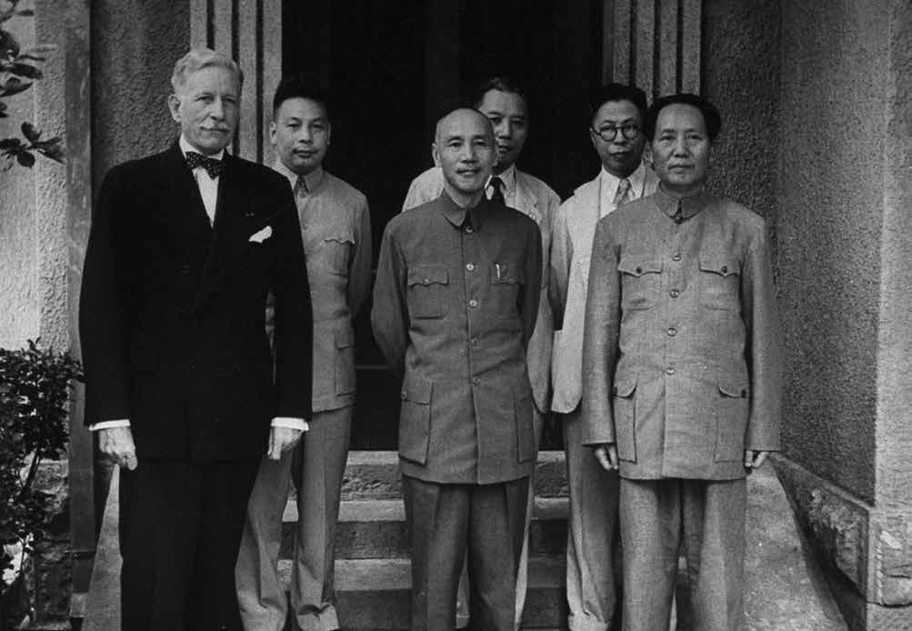 ·重庆谈判期间,毛主席(前右)与蒋介石(前中)、美国驻华大使赫尔利(前左)等一起合影。