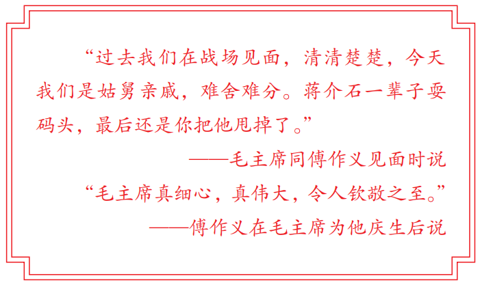 2月22日,傅作义来到西柏坡,与毛主席会面。 毛主席握着傅作义的手说:“过去我们在战场见面,清清楚楚,今天我们是姑舅亲戚,难舍难分。蒋介石一辈子耍码头,最后还是你把他甩掉了。” 谈到对傅作义部原有人员的政策时,毛主席说,要把被俘人员都放回去,令傅作义十分诧异。 毛主席解释道:“国民党不是一贯宣传共产党杀人放火,共产共妻吗?他们到了绥远,可以现身说法,共产党对他们一不搜腰包,二不侮辱人格;可以帮助在绥远的人学习学习,提高认识嘛。这些人我们以后还要用哩!” 最后,毛主席问:“傅将军,你愿意做什么工作?” 傅作义答道:“我想,我不能在军队里工作了,最好让我回到河套一带去做点水利建设方面的工作。” 毛主席说:“你对水利工作感兴趣吗?那河套水利工作面太小了,将来你可以当水利部长嘛,那不是更能发挥作用吗?” 傅作义胸中的苦闷彻底冰消雪融。他的谈判代表邓宝珊说:“不知毛主席用什么方法,一席话居然说得宜生(傅作义的字)像换了一个人!” 张治中、程潜、陈明仁……新中国成立后,这些有类似经历的起义将领均被安排要职。毛主席与他们交心交情,建立了深厚友谊。 傅作义则在水利部部长的职务上干了23年。有一年,毛主席在中南海设宴,为傅作义庆祝生日。傅作义万万没有想到,毛主席会留心到他的生日。回去的路上,他由衷地对同行者说:“毛主席真细心,真伟大,令人钦敬之至。” ![]()