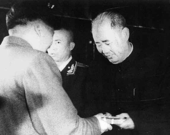 ·1955年,毛主席(左)授予傅作义(右)一级解放勋章。