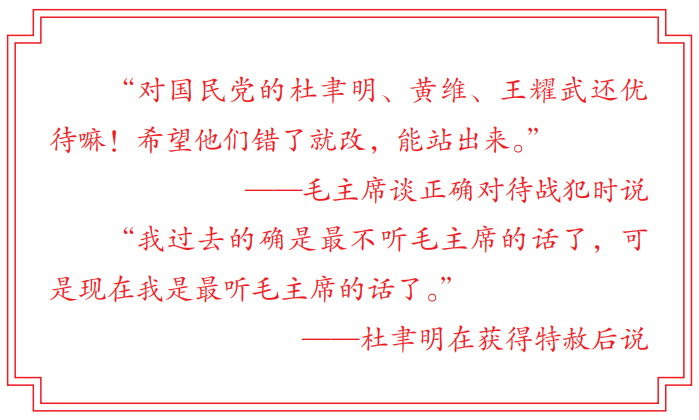 这一千万国民党党、政、军人员里,最受关注的就是国民党战争罪犯。 原国民党东北保安司令长官、徐州“剿总”副总司令杜聿明被俘后,本以为自己会像被俘的共产党人那样,不投降便遭到杀害,可左等右等,也没等到有人来问“投不投降”。 尤其让他意外的是,管理所要求战犯写交代材料,不仅是反共罪行,做过的大事都要写。杜聿明曾率部与日军殊死搏斗,取得昆仑关大捷。他觉得这是“国民党做的”,不用写,可管理所领导告诉他,抗日是关系民族生死存亡的战争,国民党抗日也是爱国行为,要他一定认真写出来。 “想不到共产党人做事这么公正。”“宁死不投降”的杜聿明,思想渐渐有了变化。 1959年,新中国迎来成立10周年纪念。毛主席以此为契机,提议赦免一批“已经改恶从善的战争罪犯、反革命犯和普通刑事罪犯”,从而更有力地“化消极因素为积极因素”。 杜聿明是首批获得特赦的战犯之一。 ![]()