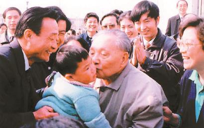 1992年2月12日,邓小平视察闵行开发区后来到马桥旗忠村,亲吻农家孩子。刊于1992年6月27日《解放日报》周末版。 照片由张蔚飞拍摄
