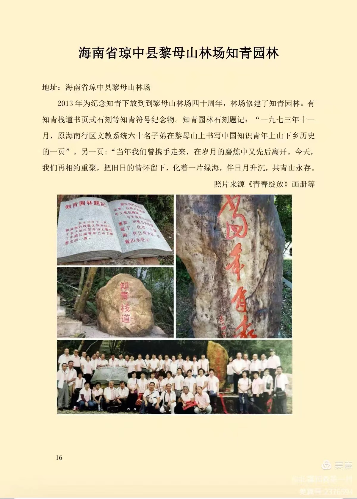 ![]() 地址:海南省琼中县黎母山林场 2013年为纪念知青下放到到黎母山林场四十周年,林场修建了知青园林。有知青栈道书页式石刻等知青符号纪念物。知青园林石刻题记:"知青園林题記 一九七三年十一月,原海南行区文教系统六十名子弟在黎母山上书写中国知识青年上山下乡历史的一页"。另一页:"当年我们曾携手走来,在岁月的磨炼中又先后离开。今天,我们再相约重聚,把旧日的情怀留下,化着一片绿海,伴日月升沉,共青山永存。 ![]() 距离琼中县城不远,有一处知青园林。资料记载建于一九七三年十一月,是当年知识青年响应国家号召来到黎母山上山下乡。2003年,知青相约重聚于此。为了纪念旧日情怀,建了这处知青园林。 访黎母山知青林园 地址:海南省琼中黎族苗族自治县黎母山国家森林公园 ![]() 因事先与海南热带雨林国家公园管理局黎母山分局大丰木材检查站的郑术桢主任联系过,报备汽车牌号。我们顺利通过两道门禁拦杆。雨雾中,沿崎岖山路,穿行热带雨林,来到黎母山分局办公大楼。 郑主任开车带路,不远处,来到黎母山知青园林。 大树下巨石上镌刻“当年有我”四个草体字。左边是一个书型石牌,上书:“【知青園林題記】 ![]() 一九七三年十一月,原海南行政區文教系統六十名子弟在黎母山上書寫了中國知識青年上山下鄉歷史的一頁。 ![]() 今天我們再相约重聚,把舊日的情懷留下,化作一片绿海,伴日月升沉,共青山永在。” 在两个知青地面纪念物旁,可见到一片被铁絲网拦着的湖面。不远处有一幢分局的工作房。 在郑主任办公室,他将电脑中保存的黎母山知青老照片和黎母山知青纪念上山下乡30周年文集,转给我们参考。 据悉,“当年有我”石刻和【知青園林題記】书型石牌,2003年黎母山知青为纪念上山下乡30年而竖立,让这段知青历史永存,告诉后人什么是知青。 2013年11月23日原科教系统七三届五十一名知青回到琼中黎母山,围聚“当年有我”石刻,合影留念。他们纷纷用笔写下了11篇回忆录。 黎母山知青回忆录目录 1、难忘的岁月——写给当年一起成长的知青朋友(陈应春) 2、回首往事向未来——上山下乡30周年(黄宏生) 3、钢铁是怎样炼成的——上山下乡40周年(黄宏生) 4、十八岁的工作证(蔡小惠) 5、难忘的日子(刘方明) 6、黎母山泉(林军) 7、难于忘怀(刘方明) 8、我的黎母山情结(刘玉慧) 9、时代的回忆,人生的感慨(陈小妹) 10、忆当年(麦绮真) 11、照片小记(吴琼) 12、两代人(倪克军) 13、磐石——生命(倪克军) 14、忆“五公里”(蔡伯章) 15、远山,呼唤离人的归来(廖果毅) 如今,人去石留,感慨万分。 (晓歌编辑) (责任编辑:晓歌) |