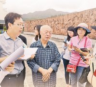 (壮丽70年奋斗新时代记者再走长征路) 本报记者再走长征路主题采访活动扫描 记者何勇(左一)在湖南桂东县寨前镇广场采访黄维忠老人。记者 申智林摄 记者颜珂(右二)跟随红军后代重访福建长汀县松毛岭战...