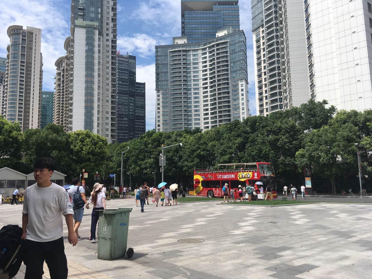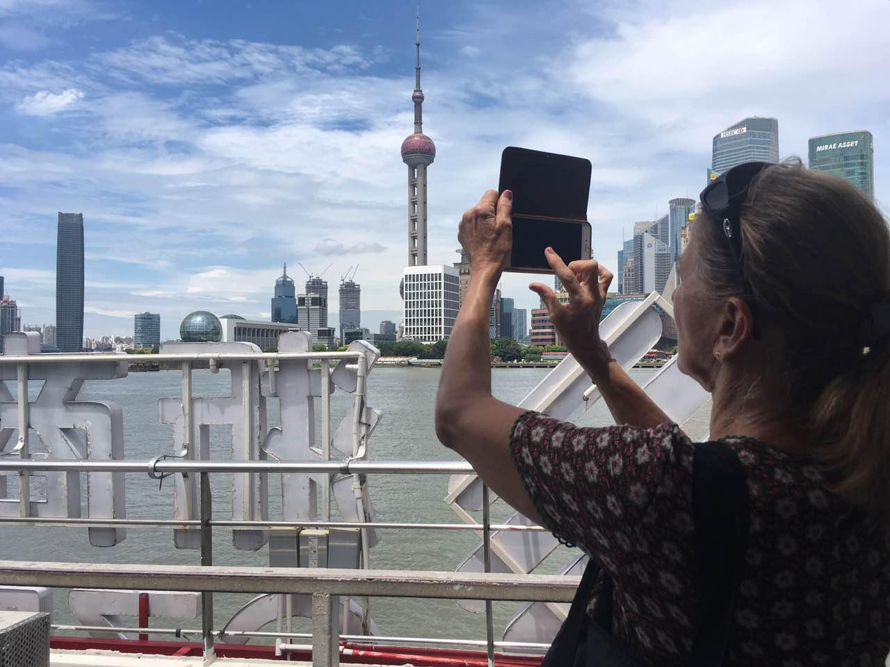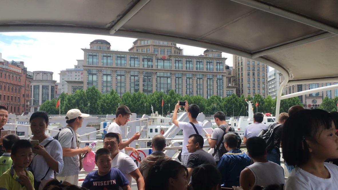 闸门一开,乘客们便纷纷涌上船,匆忙的脚步里透出难抑的兴奋。有的人马上抢占了室内有空调的座位,但更多的乘客聚集到了二层的甲板,因为这里能看到最多的江景。随着轮渡开出江面,外滩万国建筑群渐行渐远,浦东的“厨房三件套”则步步逼近。船上十分拥挤、闷热,轮渡发动机的轰鸣让甲板更加吵杂,但这丝毫没有降低游客们拍照的热情,纷纷对着江景摆出胜利的姿势。