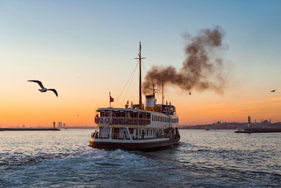 迎着夕阳行驶的轮渡。 来源:视觉中国