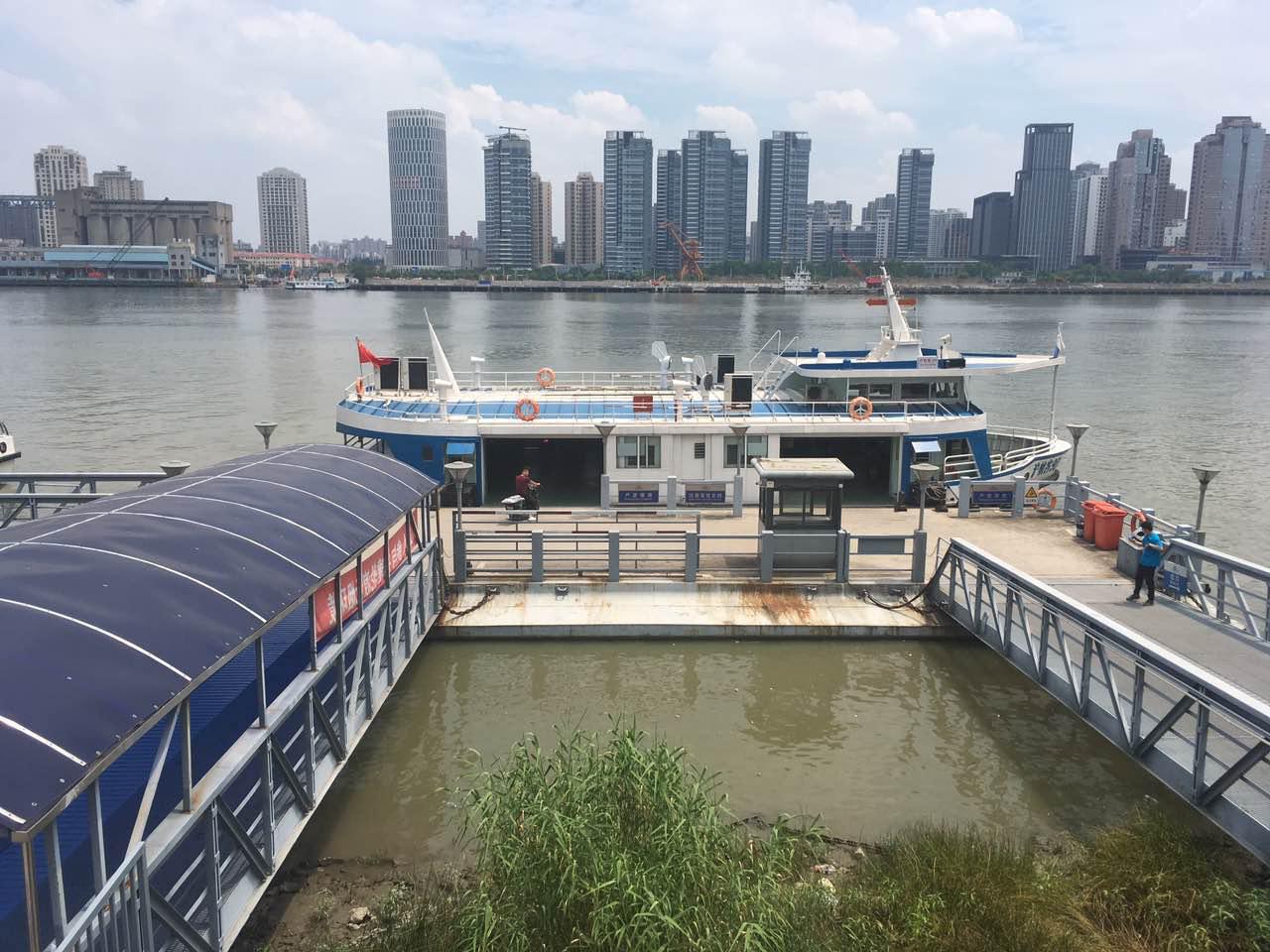 正午时分,毒辣的太阳把渡口铁栈桥上的铁皮晒得发烫变形。小周骑着电动车停在栈桥上等待下一班船靠岸。同样在栈桥上等候的还有几名开摩托车的民工,他们的车上载着装修用的梯子、工具箱和水泥石灰。随着轮渡靠岸,闸门打开。“哐当,哐当,哐当……”各种摩托车、电动车开始从左边的门上船,里面的车则从右边的门下船,每辆车子经过栈桥的末端都会发出一阵响声,伴随着有节奏的声声碰撞,船开了,向着浦东方向开去。