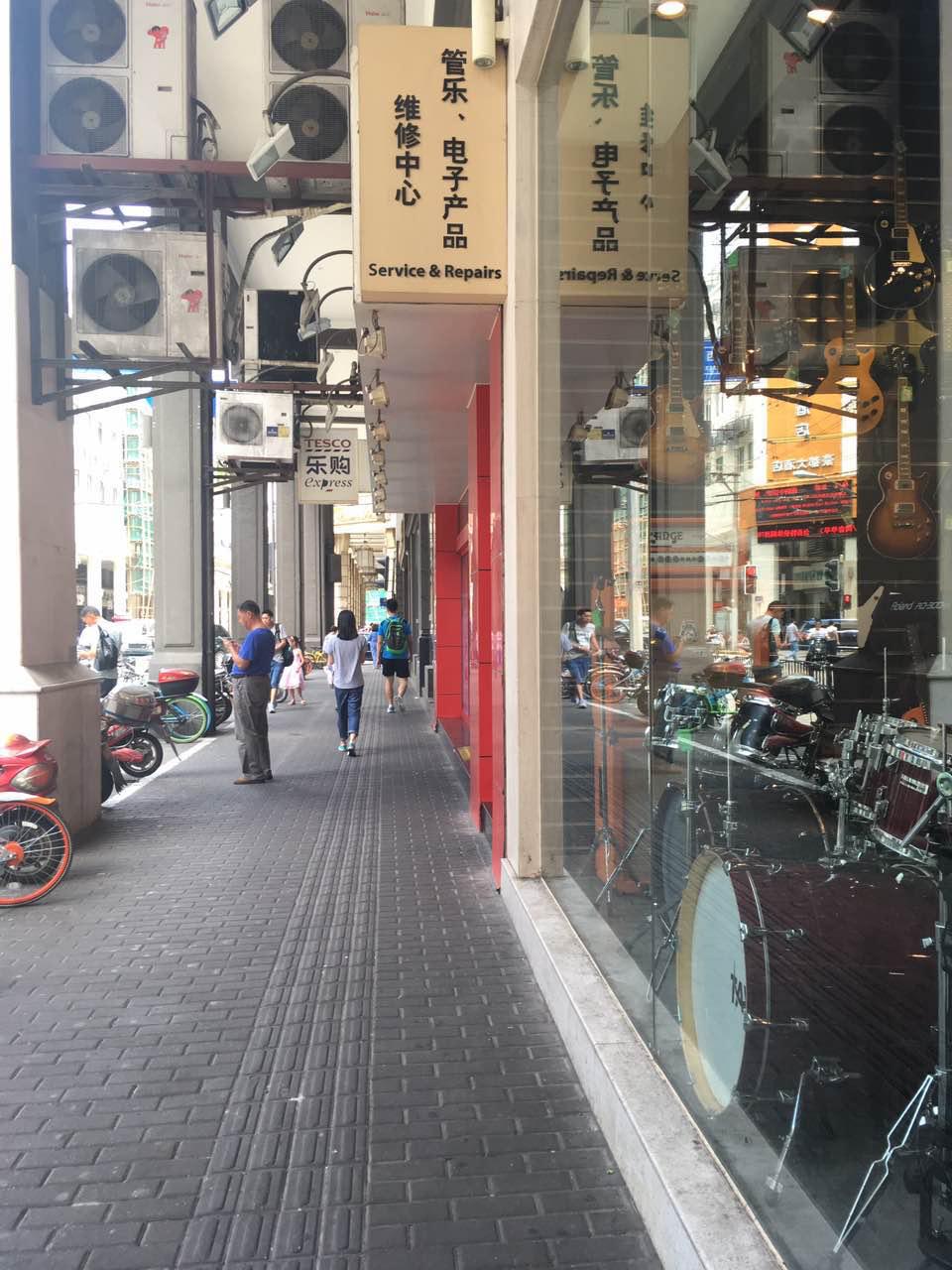 沿着金陵东路往外滩方向一直走,沿街2公里全是乐器行。海之韵琴行、挂二乐器、雅马哈琴行等老字号还保留着黑体字门面,一些新开出的琴行打通了几个店面建成现代感十足的旗舰店。金陵东路两旁都是“骑楼”,建筑物一楼临街部分建成行人走廊,二楼仿佛“骑”在一楼上面,走在骑楼里,恍如走在广东的大街上。这样一条“乐器街”,曾是上海经济中心,连接着老上海的记忆,直通到东金线轮渡站。