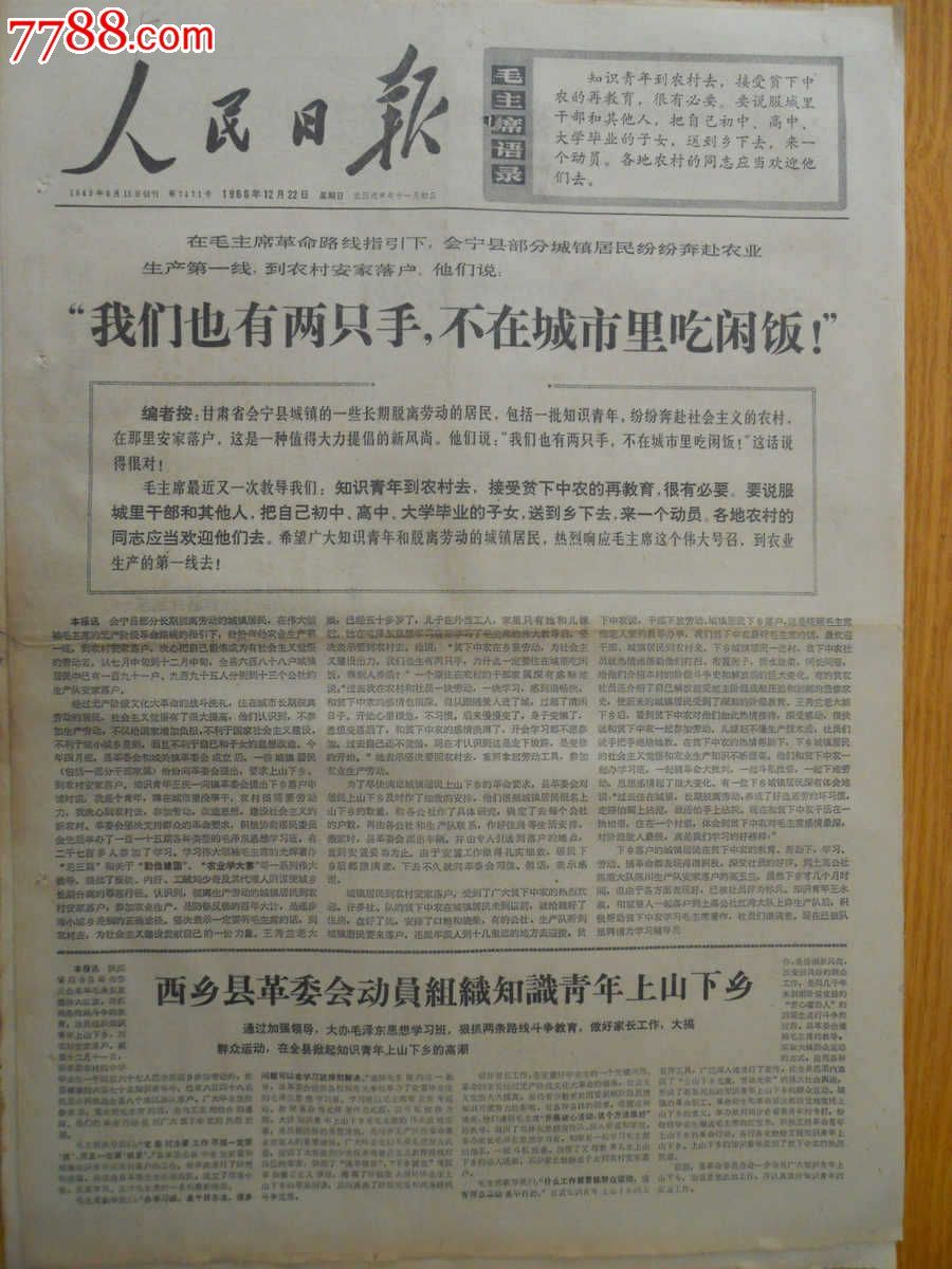 ![]() 1968年12月30日的《上海红卫战报》第三版,刊登了《毛主席送儿子参加农业生产》,没有署名,没有来源。2000余字,说的是“抗日战争胜利前夕,……毛岸英从国外回来了,……机关的同志为了照顾岸英,要他去吃中灶伙食。主席知道了,不同意,就让岸英和同志们一起吃大灶。过了几天,……毛主席还嘱咐儿子,到农村去,要和农民一起住,一起吃,一起劳动。”一位参谋找到郝光华,告诉他主席让毛岸英到他那里上“农业大学”。“一九四六年上半年,根据形势的发展,郝光华跟县委同志商量了一下,决定把岸英送回中央去。”全文在时间方面给人以含糊其辞的感觉。 笔者想起近些年在网上多次看到这样的说法:“中国最早的知青是毛泽东的儿子毛岸英。……毛泽东指出了‘知识分子走与工农相结合的道路’的理论,并首先付诸实践,将从莫斯科留学回国的大儿子毛岸英送到农村去,拜一个农民老大爷为师,成为中国第一个接受农民再教育的知识青年。”更令人不知所云。 遂上网搜索,人民日报图文数据库显示,1946年11月15日第三版有一篇400余字的短文—— 毛主席送子住劳动大学 毛岸英是毛主席的儿子,他在苏联住过莫斯科大学,最近才从苏联回来。毛主席对他说:“你住过苏联的大学,还没有住过边区劳动大学,劳动大学的校长就是吴满有,劳动大学就在吴家枣园,那里的学生,都是爱劳动的人民,你去学习,对你有很大的帮助。”毛岸英愿意去。毛主席说:“去很好,还要带些学费去。”毛主席给了一斗米,叫毛岸英背上走,走到吴家枣园,累得他满头大汗。 毛岸英刚到吴家枣园,吴满有说:“你是个洋学生,咱一个字也不识,学什么呀?”毛岸英说:“我是个小学生,啥事也不懂的,你不要客气,我爸爸让我来,向你学习”。 吴满有就开始教了。第一课开荒,毛岸英跟上变工队,上山开荒。他看见变工队的人,都把衣服脱下来开荒,他也同样去做。心想:“连校长都开荒,学生更应当开荒。”中午太阳正红的时候,他拚命地学开荒,白白的皮肉,被太阳晒得红红的,由红变黑,把皮也晒死了。过了两三天,他就学会开荒了。 毛岸英学了两个星期,就学会了开荒、上粪、锄草、下种籽、耕地。吴满有说:“毛岸英和我们的变工队一样的会种庄稼了。” (延安市九岁小学生张名哲写,登在陕甘宁边区群众报上) 上述短文在内容上与1968年12月30日《上海红卫战报》大体吻合,但是1946年的吴满有在1968年变成了郝光华!而人民日报图文数据库里只有1977年9月25日纪念毛泽东逝世一周年的文章里出现过一次郝光华,相反,吴满有却出现过62次,然而几乎全部集中在1948年9月13日之前,之后直到1992年5月14日才重新出现,迄今也只有3次。这种现象令人奇怪。 在网上发现2011年11月《名人传记》上有过《毛岸英延安“下乡”记》,其中说到,“1946年1月7日,毛岸英随苏联医生阿洛夫和米尔尼柯从苏联回到延安,毛泽东亲自到机场去迎接。……工作人员根据毛岸英在苏联红军中拥有的上尉军衔,安排他享受中灶待遇,毛泽东发现后仍然不允许,让他和普通战士一起吃大灶。……4月8日,清明节刚过,当时担任毛泽东警卫员的贺清华和驾驶员周西林一起,送毛岸英到吴家枣园。”此后,逃荒落户延安、又被推选为陕甘宁边区特等劳动英雄的农民吴满有,接收毛岸英入住自己家里,指导其学习农业生产。“由于军事形势变化,吴满有请示有关方面同意,毛岸英结束了在吴家枣园这所农村大学里的学习课程。1946年9月25日,秋收过后,吴满有亲自送毛岸英回到延安。” 看来还是吴满有,其中蹊跷何在?在网上搜索到“延安档案信息网”上《边区劳模吴满有的跌宕人生》等文章,方才得知1948年4月在攻打宝鸡的战斗中,吴满有被国民党俘虏。一开始,吴满有没有被认出来。但最后被其他人供了出来。先在西安关押,后又被送到了南京。当年9月,他和中共中原军区的另一位军官杨经曲,被安排参加记者会。随即,国民党的西安电台发表三次广播,内容是吴满有的讲话,表示他弃暗投明,脱离共产党。不管这条广播真假如何(后来有研究者认为此次广播讲话是国民党方面找人顶替的),吴满有的政治生命就此结束了。1949年11月,国民党大势已去,被关押在重庆合川的吴满有,也获得自由。1950年3月,他回到了延安。随后,被中共延安县委组织部开除党籍。据说,王震曾从新疆派人来到吴家枣园,准备接其到新疆去,遭到了他的拒绝。吴满有曾托人先后三次给党中央写信申诉冤屈,都无回应。1957年,全国都在搞人民公社,动员农民入社,吴满有死活不入。他变得越来越沉默孤独,一个人在山上放羊,经常泪流满面。晚年因患白内障,吴满有双眼失明,瘫痪在炕上一年多时间。1959年3月,吴满有在吴家枣园郁郁而终,享年66岁。 由此看来,六十年代初,人民日报有过2次提及毛岸英当农民,均未述及吴满有,是事出有因的。1968年12月30日《上海红卫战报》刊登的那篇文章,采用了改名换姓的手法!同一时期,1969年1月下半月人民日报两次报道“首都第一批知识青年到革命圣地延安农村安家落户”时,则回避了吴满有其人其事。 呜呼!如此历史,难以想象,不可思议! 1968年12月30日宣传毛岸英的同时,报道了“在毛主席最新指示的鼓舞下 在欢庆毛主席寿辰的日子里 下乡上山插队落户掀起新高潮”。其中值得录以备忘的是:“秀水中学三十七个六七届毕业生,学习了毛主席的最新指示