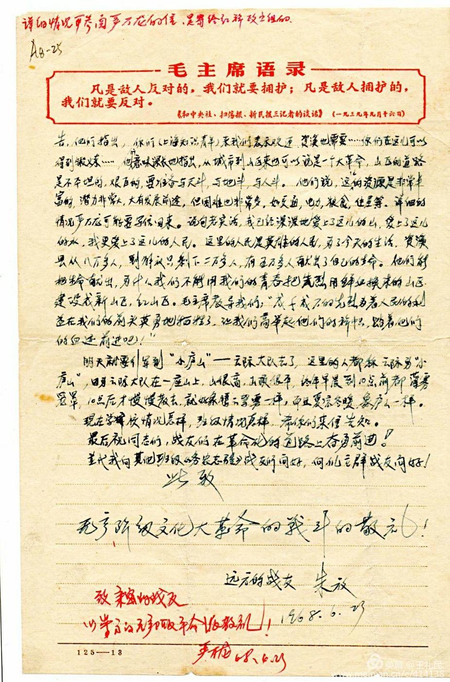 ![]() ![]() ![]() 当时绝大多数的学生还在"复课闹革命”。 朱放是上海市北中学66届初三(3)班学生,同年去了黑龙江生产建设兵团八五六农场,次年转红卫农场(六师62团)。 ![]() 50年后,朱放先生见到这封信,写下以下感言: 这是人民大学胡似教授捐赠资料中的信件。是我在上海赴江西省资溪县石峡公社勘查小分队工作期间写给在校同学和老师的一封信。主要是汇报小分队前一段工作的情况和下一步的工作安排。 1968年,我和胡教授一起,全程参加了这支小分队的工作。小分队是6月18日从上海出发。在当地的支持下,经过22天的勘查、调研,于7月11日返回上海,提交了书面的《建场规划报告》。 当年上海先后派出多支队伍,分别到江西和黑龙江考察、勘查,准备建立农场。我们参加的是其中一支勘查小分队。这封信真实地反映出当年老三届中的出现的一股“不怕艰苦,青春报国”的浪潮。 后来,我和胡教授,先后都去了黑龙江兵团。 上海知青资料研究中心的王宗仁先生,在研究上海市中学生1968年开始毕业分配去向时,讲到了这封信, ![]() 江西小分队当年资料(朱放信)解读 与朱放同为小分队队员的胡拟先生(人大教授),于2017年6月13日向上海知青资料中心,捐赠一批资料,其中包括了这封信,还有《建场初步方案报告》,考察日记、来往书信,现场照片,使用的地图和当地赠与的毛著等 ![]() 资料中心的江克定先生已将这批资料扫描归档 资料中心的王宗仁先生曾就此有过文章,我的好友毛大德、傅矢修、小龙、钟长顺等也曾是同期不同小分队的成员。 今年是下乡50周年,愿朱放50年前的这封信能勾起曾经下过乡同仁的回忆。 (责任编辑:晓歌) |