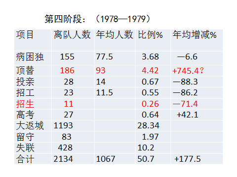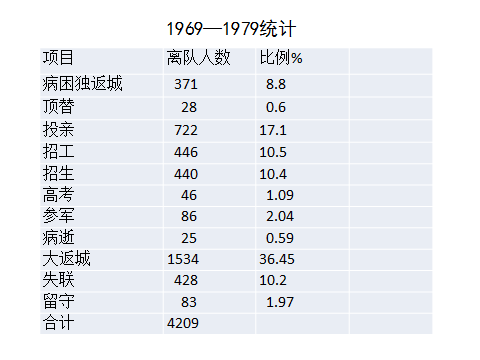 第四阶段:两个结果 两个结果,指的是“大返城”和“留守”农村。 于1978年年初开始的“插队知青大返城”,其实是一个统称,它从一开始的“病退”,转而加上“顶替”、“家庭困难”,直至当年10月份后对插队知青的无条件“调回”,都应该归于“大返城”这个大类。由于部分知青对此认同不一,在调查和统计时难免会按大返城回沪的原因而将其细分了。 此外,本阶段失联的428人,分为两种情况: 一是在1978年春节前转点南方农村并旋即被当地招工,仅差两三个月,就错过了“大返城”回沪,他们不想再见到“大返城”回沪的知青,这部分知青人数极少,几乎可以忽略不计; 二是虽然“大返城”回到了上海,却因为种种原因,他们不愿再回忆插队经历,刻意回避了曾经的知青。 即使将这些人都算入“大返城”,“大返城”回沪的爱辉上海知青也不过1962人,占受调人数的46.6%。即:“大返城”回沪的知青肯定连一半都不到。 至于83名留守农村的爱辉上海知青,从另一角度透露出一个信息:插队期间,爱辉上海知青中起码有83名与当地青年在农村成婚了。当然,这不包括上海知青与上海知青的结婚和上海知青离队后与当地青年的结婚。 留守农村的83名上海知青在1979年上半年“大返城”之风过后不久,便全部按政策在当地被招工。其中也有让出招工名额给其配偶,自己仍生活在农村的。 不管怎么说,以上所谓“大返城”和“留守”两种结果,都只能算作阶段性结果。因为历年来投亲转点、招工、上学等原因“离队”的爱辉上海知青中,大部分并没有在“大返城”风中回到上海。他们后来通过曲折的路和漫长的时间,甚至直到退休后,才回到了当年上山下乡的出发地—上海。2019年7月,爱辉上海知青组织重访爱辉活动,与16名现居住在黑河的爱辉上海老知青见面,他们中大多已经不再想把户口迁回上海了。 ![]() 1、本阶段少了两个统计项目:“参军”、“病逝”,是因为这两项客观上为空白。 2、在1978年还有11人作为推荐上学,主要是一些并没有列入国家统招的中专。 3、1978年高考录取的人数比1977年增加8人达到27人,是因为对文化底子较薄的68、69届来说,有了半年多复习迎考的时间,这一点很重要。 4、原统计中1977年有“大返城15人”,实际上有“大返城”政策是1978年,当时于1977年回上海的这15人没回生产队,直接参加了1978年开始的大返城,应纳入1978年统计。 5、本阶段招工23人,投亲转点28人,人数都很少,是因为发生在不知插队知青可以“大返城”的1978年3月之前。此后,再无招工和投亲转点者。 对于“插队知青大返城”的政策,这里还想作一个分析,即它是一个渐近式松动的过程。从1978年2月到年底,短短10个月里,插队知青回城政策发生了六个变化: 一、1978年2月10日,中央办公厅转发国家计委《关于经济计划的要求》,指出:对于尚在农村的知青,要解决他们的实际问题,使他们安心在农村。 二、1978年3月28日,邓小平同胡乔木等谈话时指出:现在是搞上山下乡,这种办法不是长期办法,要开辟新的经济领域,做到容纳更多的劳动力。 4月初,消息传开,各地针对插队知青的病退条件开始松动,但与兵团农场的知青无缘。 三、1978年5月24日,第五届全国人大常委第二次会议,原则批准国务院《关于工人退休、退职的暂行办法》,其中提到:工人退休、退职后,可招收一名符合条件的子女参加工作,按政策规定留城。 同月,上海规定插队知青病退要由当地县以上医院开证明,到上海再复查,当地县医院一开始还认真,然后毫无例外地走后门,最后干脆发展到你说啥病医院就开啥病的证明。 5月下旬,上海市乡办联合市劳动局向市委、市革委会呈送《关于1978年-1980年统筹安排知识青年的规划意见的报告》,提出:对于外地插队青年的安置采取以下四种解决办法:职工退休、退职、死亡后招收其一名符合招工条件的下乡子女安排工作;按政策规定继续办理病退;有特殊困难的下乡青年照顾回安排工作;对余下的在外地插队青年实行定期补助。 四、1978年6月24日,杨浦区乡办就病退回沪知青规定致函江西省峡江县知青办,文件透露上海的规定:插队知青确患有严惩慢性疾病,难以坚持正常农业劳动,且有足够病史依据,诊断明确,经县知青办审核后,双方协商处理;对已招工、升学的知青,不再办理病退;对已婚知青,原则上不办理病退,凡为病退而离婚的也一律不予办理。 五、1978年7月3日,胡耀邦同国务院知青办主任谈话时指出:上山下乡这条路走不通了,要逐步减少,以至做到不下乡。这是一个正确的方针,是可能做到的。 同月,上海有关部门提出:适当放宽困退、病退条件,对符合规定的,计划在3年内召回16万到17万人,逐步安排适当工作。 消息传开,仍在农村的知青表示,情愿倒马桶(指当倒粪站工人)也要回上海,一部分参加高考的知青估计自已考不回上海,干脆放弃,加入病退大军。 此月回上海搞病退的知青人数达到高潮,因拍片确诊的人太多,以至于上海多家医院连拍片子的片源都断档。 六、1978年10月18日李先念在中央政治局会议上说:社会上议论很多,“四不满意”是我讲的。青年不满意,家长不满意,社队不满意,国家也不满意嘛! 这年年底,上海实际上不再办理病退手续,只要是仍在农村插队的、符合条件的(没有在当地工作、上学以及与当地人结婚)上海知青都可调回。 作为占全国知青大多数的插队知青之“大返城”,