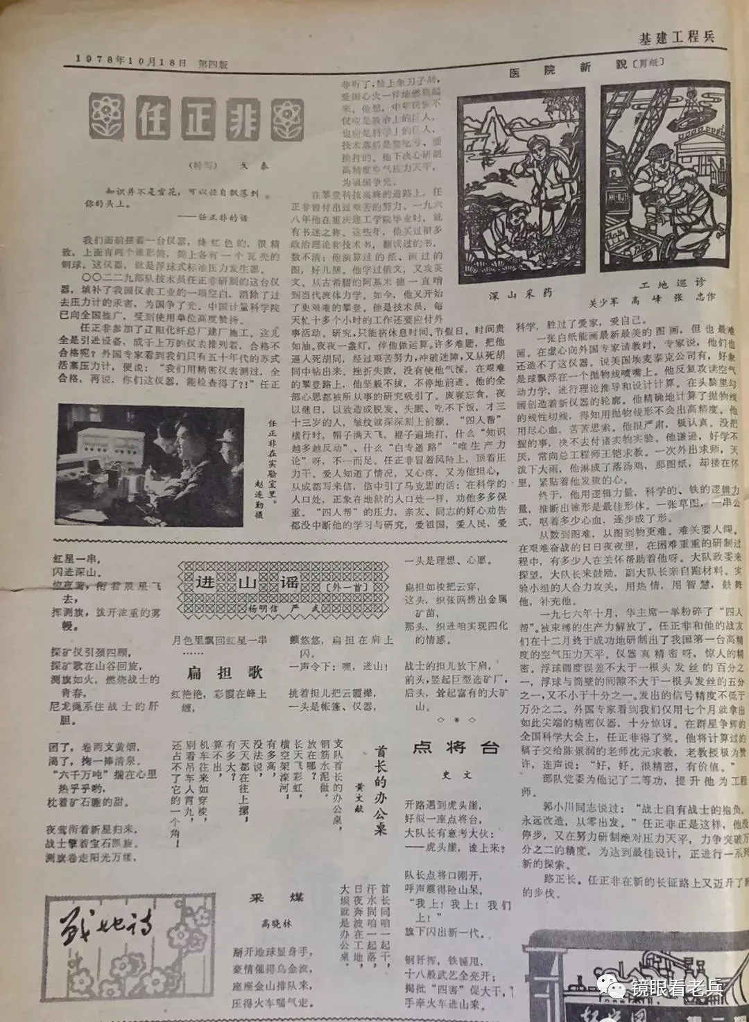 ![]() 最新发现:41年前的1978年10月18日《基建工程兵》报,在这份已经泛黄报纸的第四版,用大半个版面刊登报道任正非事迹的新闻特写《任正非》。 这篇报道引用任正非的话作为名人名言开头,这在当时可见宣传规格之高。从文中可以看出,任正非当年33岁,由于研制出空气压力天平,填补了我国仪表工业的一项空白,表现突出,刚刚由技术员提拨为工程师并荣立二等功。 今天,读罢这篇报道,深深领会到“机会总是留给有准备的人”这句话的真正内涵是什么。 任老总确确实实了不起啊!他是〇〇二二九部队的光荣,是基建工程兵的骄傲,更是解放军的骄傲! 1978年10月18日《基建工程兵》报第四版用大篇幅刊登深度新闻特写《任正非》 ![]() 原文全文如下: 知识并不是雪花,可以径自飘落到你的头上。 ——任正非的话 我们面前摆着一台仪器,绛红色的,很精致,上面有两个锥形筒,筒上各有一个瓦亮的钢球。这仪器,就是浮球式标准压力发生器。 〇〇二二九部队技术员任正非研制的这台仪器,填补了我国仪表工业的一项空白。消除了过去压力的汞害,为国争了光。中国计量科学院已向全国推广,受到使用单位高度赞扬。 任正非参加了辽阳化纤总厂建厂施工。这儿全是引进设备,成千上万的仪表排列着,合格不合格呢? 外国专家看到我们只有五十年代的苏式活塞力计,便说:“我们用精密仪表测过,全合格,再说,你们这仪器查得了?!任正非听了,脸上象刀子刮,爱国心火一样地燃烧起来。 他想,中华民族不仅应是政治上的巨人,也应是科学上的巨人,技术上落后是要吃亏、要挨打的。他下决心研制高精度空气压力天平,为祖国争光。 在攀登科技高峰的道路上,任正非曾付出过艰苦的努力。一九六八年他在重庆建工学院毕业时,就有书迷之称。 这些年,他买过很多政治理论和技术书,翻读过的书,数不清;他演算过的纸、画过的图,好几捆。 他学过俄文,又攻英文。从古希腊的阿基米德一直啃到当代流体力学。如今,他又开始了更艰难的攀登。 他是技术员,每天忙十多个小时的工作还要应付外事活动。研究,只能挤休息时间、节假日。时间贵如油。 夜夜一盏灯,伴他做运算。许多难题,把他逼入死胡同,经过艰苦努力,冲破迷障,又从死胡同中钻出来。 挫折失败,没有使他气馁,在艰难的攀登路上,他坚毅不拔,不停地前进。他的全部心思都被所从事的研究吸引了。 废寝忘食,夜以继日,以致造成脱发、失眠、吃不下饭,才三十三岁的人,皱纹就深深刻上前额。 “四人帮“横行时,帽子遍地打,什么”知识越多越反动“、什么”白专道路“”唯生产力论“呀,不一而足。任正非冒着风险上,顶着压力干。 爱人知道了情况,又心疼,又为他担心,从成都写来信,信中引了马克思的话:在科学的入口处,正象在地狱的入口处一样,劝他多多保重。 “四人帮”的压力,亲友、同志的好心劝告都没有中断他的学习研究,爱祖国,爱人民,爱科学,胜过了爱家,爱自己。 一张白纸能画最新最美的图画,但也最难画。在虚心向外国专家请教时,专家说,他们也还造不了这仪器。说美国埃麦泰克公司有,好象是球飘浮在一个抛物线喷嘴上。 他反复攻读空气动力学,进行理论推导和设计计算。在头脑里勾画创造着新仪器的轮廓。 他精确地计算了抛物线的线性切线,得知用抛物线形不会出高精度。他用尽心血,苦苦思索。他很严肃,极认真。 没把握的事,决不去付诸实物实验。他谦逊,好学不厌,常向总工程师王铠求教。 一次外出求师,天泼下大雨,他淋成落汤鸡,那图纸,却搂在怀里面,紧贴着他发烫的心。 终于,他用逻辑力量,科学的、铁的逻辑力量,推断出锥形是最佳形体。一张草图,一串公式,呕着多少心血,逐步成了形。 从数到图难,从图到物更难。难关要人闯。在艰难奋战的日日夜夜里,在困难重重的研制过程中,有多少人在关怀帮助着他呀。 大队政委来探望,大队长来鼓励,副大队长亲自跑材料。实验小组的人合力攻关。用热情,用智慧,鼓舞他,补充他。 一九七六年十月,华主席一举粉碎了“四人帮“。被束缚的生产力解放了。任正非和他的战友们在十二月终于成功地研制出了我国第一台高精度的空气压力天平。 仪器真精密呀,惊人的精密。浮球圆度误差不大于一根头发丝的百分之一,浮球与筒壁的间隙不大于一根头发丝的五分之一,又不小于十分之一。 发出的信号精度不低于万分之二。外国专家看到我们仅用七个月就拿出如此尖端的精密仪器,十分惊讶。 在群星争辉的全国科学大会上,任正非得了奖。他将计算过的稿子交给陈景润的老师沈元求教,老教授极为赞许,连声说:“好,好。很精密,有价值。” 部队党委为他记了二等功,提升他为工程师。 郭小川同志说过:“战士自有战士的抱负,永远改造,从零出发。”任正非是这样,他没停步,又在努力研制绝对压力天平,力争突破万分之二的精度,为达到最佳设计,正进行一系列新的探索。路正长,任正非在新的长征路上又迈开了新的步伐。 一位多年专注研究任正非的专家表示,目前媒体对于任正非成长经历的报道大多是来自坊间的传说,其真实度往往存疑。 而公开报道中,任正非本人又极少谈论或者轻描淡写讲述人生的过往历程。这份报纸的发现对于系统地研究任正非具有极高的价值。 后记: 人们眼中的牛人之所以卓越非凡,并非天资超人一等,而是付出了持续的努力,不懈的