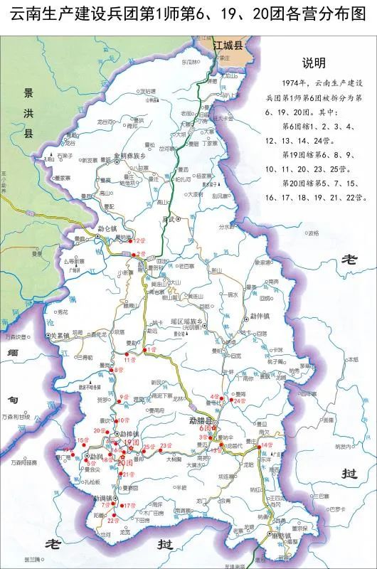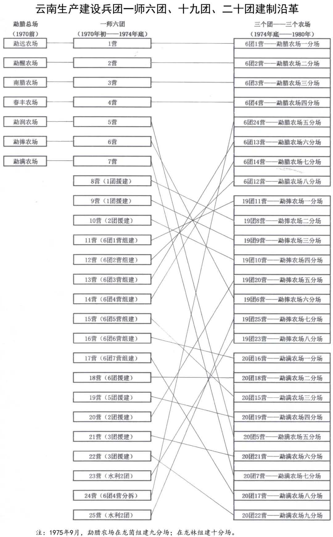 ![]() 说起云南生产建设兵团,有几句顺口溜: 兵团老大第一师, 一师老大第六团, 六团号称“天下第一团”。 改换门庭 “天下第一”,的确不是在吹牛。 中国人民解放军云南生产建设兵团第一师第六团位于云南省西双版纳州勐腊县境内,团部设在勐腊县城南,是由原国营勐腊总场改制而成的。 1970年初,国营勐腊总场改换门庭。摇身一变,成了中国人民解放军云南生产建设兵团第一师第六团,原来所管辖的 7 个农场:勐远、勐醒、南腊、春丰、 勐润、勐捧、勐满农场,依次被改名为第一、二、三、四、五、六、七营。与此同时,原来各个农场所管理的生产队,则改成了连队。 农场改兵团,基层能够感受到的主要变化:就是更换了领导和对领导的称呼。军队现役干部一般官升一级,被派到连以上岗位担任连长、指导员、营长、教导员、团长、政委。原来农场的干部则官降半级,就地担任副职当起了配角。而对于普通的农场职工来说,该干活干活,该吃饭吃饭,该生娃生娃,似乎也没有什么大的区别。但是,对于远在千百里之外,即将成为“知识青年”的上海、北京、成都、重庆、昆明等城市里的中学生来说,“中国人民解放军云南生产建设兵团”听起来的确很“拉风”,至少要比“云南省农垦局”听着过瘾。因为,在那个“政治挂帅”的年代里,军队简直就是红色保险箱啊!有道是:“吃菜要吃白菜心,嫁人要嫁解放军”。哪怕徒有虚名,那也不错。 茁壮成长 随着各地知识青年的大量涌入,短短几年,第六团的规模不断扩充。到1974年,居然从组建初期的7个营,扩大到了25个营。这哪像是一个团呀?差不多能赶上一个军的编制了。难怪第六团的人可以牛皮烘烘的自称“天下第一团”了。 当然,罗马,不是一天建成的。 第六团大扩容,陆续发生在1970年底和1974年间,具体做法是: 1. 老带新,一变二 第六团所辖的7个老营以及团部,各自负责组建一个新营,即:第一营组建第十一营;第二营组建第十二营;第三营组建第十三营……第七营组建第十七营;团部组建第十八营。合计增加了8个营。 2. 兄弟团,来支援 第一团(景洪农场)帮助组建第八、九营;第二团(东风农场)帮助组建第十、二十营;第三团(勐养农场)帮助组建第二十一、二十二营;第五团(黎明农场)帮助组建第十九营;合计增加了7个营。 3. 水利团,并进来 位于勐腊县境内的水利工程第一团撤销,人员是安置到六团各营的;而水利工程第二团撤销,则就地组建为第六团第二十三、二十五营。与此同时,原第六团第四营调整分拆为第四、第二十四营,合计增加了3个营。 就这样,第六团从组建之初的7个营,变成了25个营。 水满则溢 就在第六团建成25个营的同时,老大的位置也就当到了头。1974年3月,兵团党委决定,将这个庞然大物剁成三块,变成了第六、第十九、第二十团。 第六团的减肥方案,最终是这样敲定的: 第六团留下8个营:第一、二、三、四、十二、十三、十四、二十四营。 第十九团带走8个营:第六、八、九、十、十一、二十、二十三、二十五营。 第二十团带走9个营:第五、七、十五、十六、十七、十八、十九、二十一、二十二营。 “天下第一团”寿终正寝。一转眼儿子变成了兄弟;自家人变成了邻居。 不过,此时此刻,云南生产建设兵团也走到了历史的尽头。第六团宣布重组大约三个月后,1974 年 6 月 26 日,云南省委、昆明军区同时接到了国务院、中央军委关于撤销云南生产建设兵团的批复。 兵团撤销后,第六团改名为国营勐腊农场;第十九团改名为国营勐捧农场; 第二十团改名为国营勐满农场。各团所属的营则改成了分场。 ![]() 几点争议 “天下第一团”是没有争议的。但是,老六团究竟拥有多少个营?看法并不一致。其中 1970 年到 1971 年组建的 22 个营是没有问题的,分歧主要是 1974年新组建的第二十三、二十四、二十五营,能不能算在老六团的名下? 有三种说法: 第一种说法是23个营。依据是水利二团撤销后就地组建的第二十三营和第二十五营事实上是直接划归第十九团管辖的,跟老六团没有什么关系。即便第二十四营是由第四营拆分出来的,可以算是六团,那顶多也就是23个营。 第二种说法是24个营。依据是云南生产建设兵团文件“兵发(1974)81号”《关于团改农场的名称、机构设置及编制的意见》。文件列表中并没有第二十五 营,由此可以断定,组建第二十五营是第十九团筹建组的决定,尚未报批。 第三种说法是25个营。依据是钱明达的回忆文章《团结奋进谱新篇》。钱明达是老六团副团长,分团时任第十九团筹建组负责人、勐捧农场第一任场长。他在文章中明确写道六团有25个营(详见《国营勐捧农场志》第 549 页)。 事实上,六团分家是个过渡过程,而且与收编水利团几乎是同时进行的。在这个过程中并没有太严格的时间分界线。甚至分团以后连团长、政委都没有来得 及任命,就改为国营农场了。所以,原本都是一家人,23 个营还是 25 个营的确无关紧要。本文采纳了 25 个营的说法,是依据了钱明达的文章。 故事未完 “天下第一”是当不成了。但是,第六团(此刻已叫国营勐腊农场)似乎仍有扩张的冲动。六团分家一年以后1975年9月,勐腊农场在龙茵组建了九分场;在龙林组建了十分场。这样,勐腊农场分场的数量跃居了勐腊县三个国营农场之首。若是建设兵团没有撤销的话,这应该是第二十六营和第二十七营了。 ![]() 这样