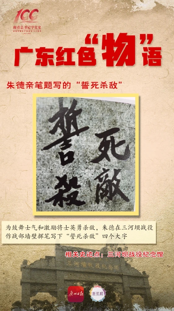 1927年八一南昌起义后,国民党反动派调兵遣将,实施围剿。起义部队主动撤离南昌,南下广东,目标是“先得潮汕、海陆丰,建立工农政权,后取广州,再举北伐”。同年9月18日,部队进抵广东大埔县城。同年10月1日,国民党钱大钧率部队2万余人阻止起义军南下,与我军3000余将士在三河坝展开了激战,这就是著名的“三河坝战役”。 今天的“广东红色‘物’语”专栏,讲述的就是新中国成立后在梅州大埔建起的八一起义军三河坝战役烈士纪念碑、纪念馆、纪念园以及可歌可泣的战斗故事。 ![]() 一件红色文物丨“誓死杀敌”标语:战役总指挥朱德为鼓舞士气,在指挥部旁的墙壁上写下这四个大字 在梅州市大埔县三河镇汇东村三河坝战役的总指挥部——田氏宗祠,由朱德在指挥三河坝战役时书写的“誓死杀敌”四个墙体大字,格外引人注目。这四个黑体字用墨汁书写在田氏宗祠旁边的培兰居老屋的墙面上,每个字体大约占墙面长16厘米、宽15厘米。虽然时过90余年,墙面字迹至今依稀可辨,当年敌我双方战斗之惨烈艰难由此可见一斑。 ![]()