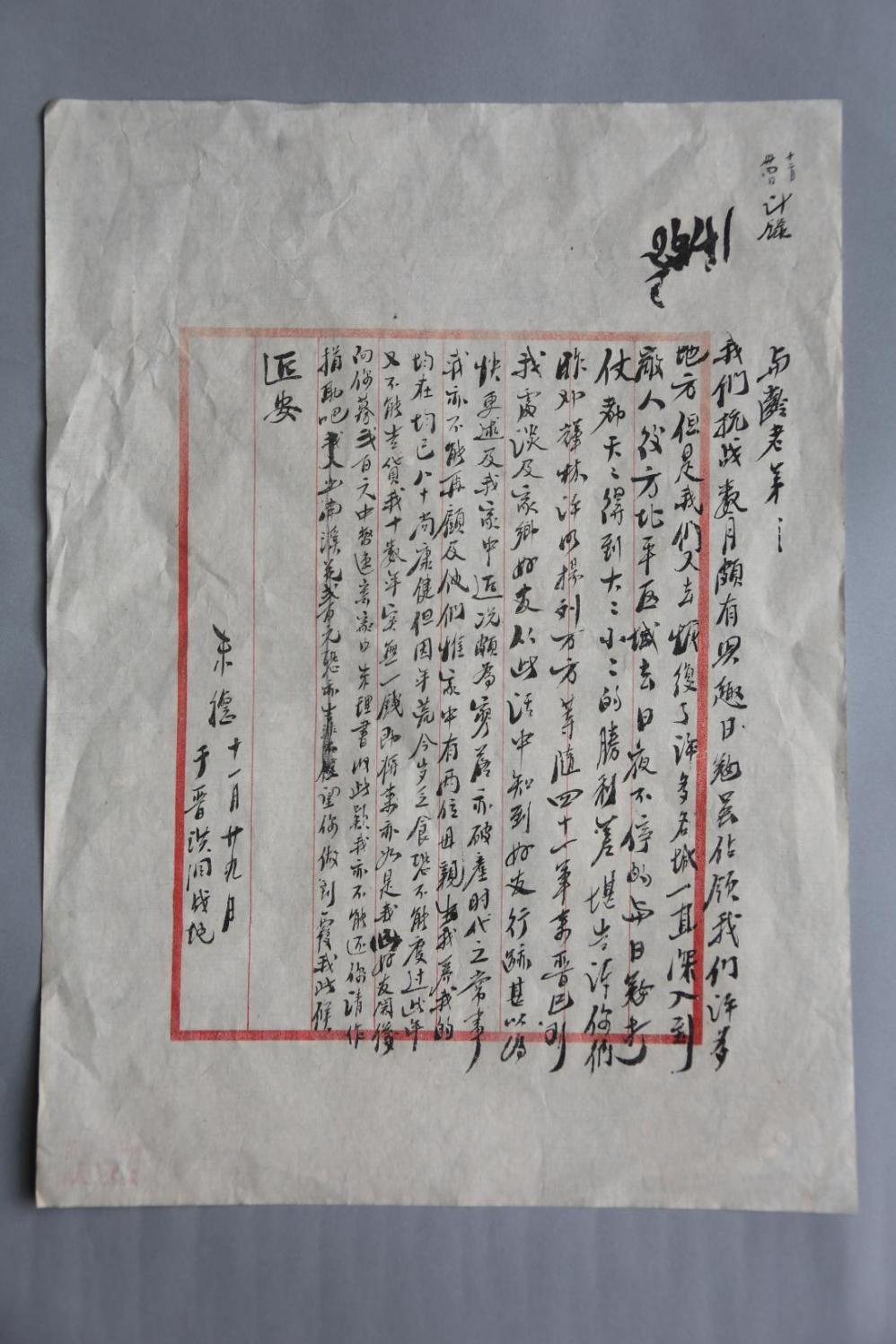 【信件全文】 与龄老弟: 我们抗战数月,颇有兴趣,日寇虽占领我们许多地方,但是我们又去收复了许多名城,一直深入到敌人后方北平区域去日夜不停的(地)与日寇打仗,都天天得到大大小小的胜利,差堪告诉你们。昨邓辉林、许明扬、刘万方等随四十一军来晋,已到我处,谈及家乡好友,从此话中知道好友行迹,甚以为快,更述及我家中近况颇为寥落,亦破产时代之常事,我亦不能再顾及他们。惟家中有两位母亲,生我养我的均在,均已八十,尚康健。但因年荒,今岁乏食,恐不能度过此年,又不能告贷。我十数年实无一钱,即将来亦如是。我以好友关系向你募贰佰元中币速寄家中朱理书收。此款我亦不能还你,请作捐助吧。望你做到复我。 此候 近安 朱德 十一月廿九日 于晋洪洞战地 【解读】 1937年11月6日,朱德在山西昔阳县写信,望陈玉珍变卖书籍及家中产业以救济母亲。但朱德内心充满着矛盾,想到陈玉珍作为他的前妻,一个女人十年来支撑四川南溪家庭已经十分不容易,恐她无钱再支持家乡母亲。他感到很犯难,最终他想到了此时在泸州以开药店为生的旧日好友戴与龄。 戴与龄生于1888年,小朱德两岁,是四川仪陇县马鞍人。他们感情真挚,还一同参加过科举,都考过了乡试和府试。1916年的护国战争中,朱德还邀请戴与龄出任本团军需官,次年他又升任朱德旅部的军需处长。朱德万里寻党、在德国和苏联学习期间,戴与龄多次接济朱德。1926年朱德回国在朱培德部工作时,戴与龄担任第三军军官教育团军需官,后升任第九军军需处长,还追随朱德参加了南昌起义。他们密切合作、坦诚相待,论公论私,都是惺惺相惜的挚友。1937年11月29日,朱德提笔给戴与龄写信,希望他接济川中老母。 信的起首,以“老弟”称呼戴与龄,既亲近又反映出朱德与戴与龄的深厚友情。朱德首先向老友介绍了抗战的情况,从“收复了许多名城”“深入到敌人后方”“天天得到大大小小的胜利”等话语中,不难看出朱德对中国抗战的信心。随之,朱德通过“差堪”二字,委婉地提到如何得知好友戴与龄和自己家庭的境况,并为好友开药店由衷地感到高兴。同时,他忧心忡忡地向好友戴与龄倾诉家中的困难:两位母亲遭遇荒年,又年高乏食、不能告贷、无以为生。而自己为革命事业,“实无一钱,即将来亦如是”,因此希望以好友关系向戴与龄募钱200元,寄给老家的朱理书。读信至此,令人唏嘘不已。人们不禁要问八路军总指挥连这点钱都拿不出来?然而,这就是事实,这就是八路军的艰苦朴素、廉洁奉公作风的一个真实缩影。那句“此款我亦不能还你,请作捐助吧”,字里行间不仅反映出朱德的拮据和抗战的艰辛不易,更承载着二人友情的弥足珍贵。此时此刻,朱德能托付的除了玉珍,就只有戴与龄了。从信的落款可知,此时朱德正在抗战的最前线,他的心,一头关注着瞬息万变的战场,一头牵挂着万里之外的母亲。 这封承载着报国之志、孝母之心和勤廉之德的特殊信件,字里行间透出的恳切和无奈,深深感染了戴与龄。戴与龄接信后立即给朱母寄去200元,使饥饿中的两位老人渡过了难关。此后,他勒紧裤带,节衣缩食,多次捐助朱德的亲属,并动员自己的亲属十几人投身陕北或华北抗日前线,因为他相信朱德要走的路和做的事是正确的,是值得他尽心竭力来支持的。 责任编辑:日升 (责任编辑:日升) |