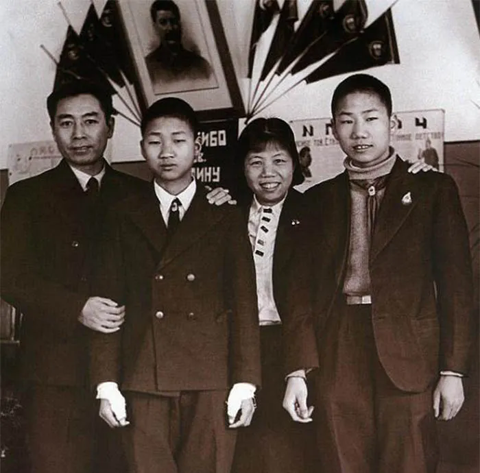 ◆1940年,周恩来、邓颖超到苏联国际儿童院看望毛岸英(右一)、毛岸青(右三)。