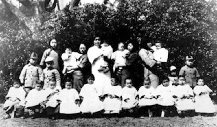 ◆1931年大同幼稚园部分保育员与幼儿。二排左一、右一、右二分别为毛岸英、毛岸青和毛岸龙。