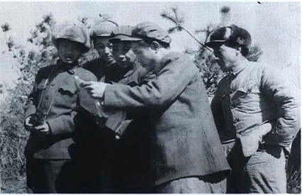◆1952年10月,秦基伟在朝鲜战场听取第45师135团英雄八连指导员王士根关于坚守上甘岭的汇报。