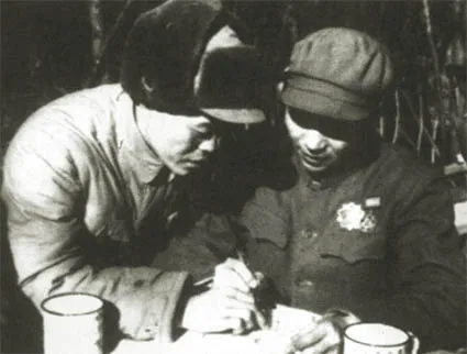 ◆秦基伟(中)在朝鲜战场研究作战方案。